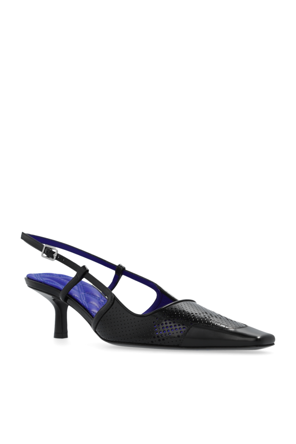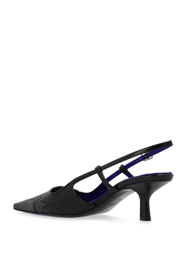 Black ‘Chisel’ pumps from Burberry. Made from calf leather accentuated with perforated roses, this model sits on a black leather sole embellished with a blue ‘Equestrian Knight’ motif and features an elongated, square toe and a buckle strap.