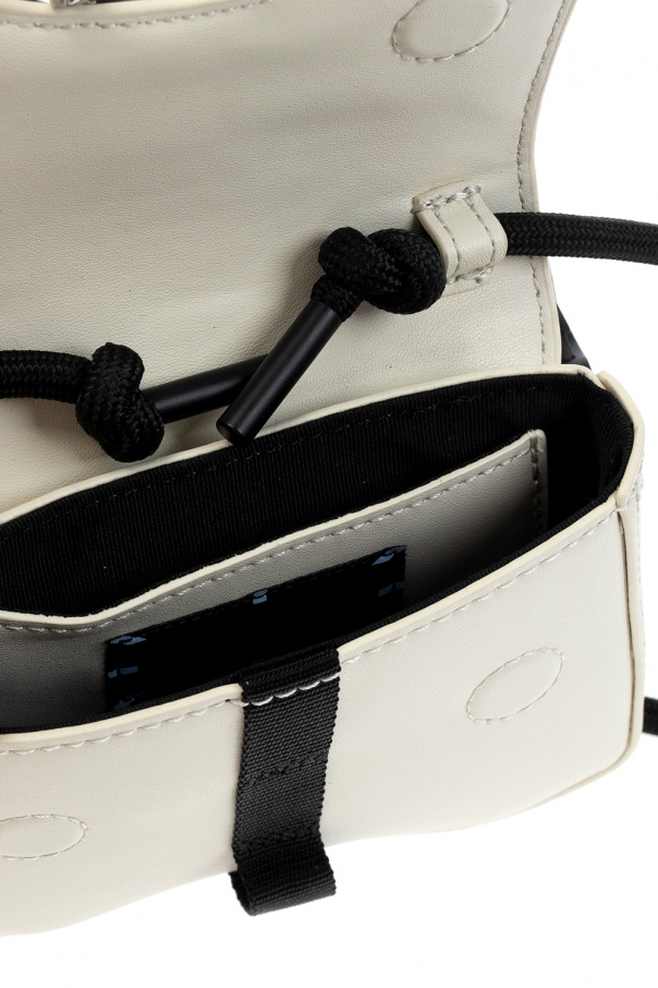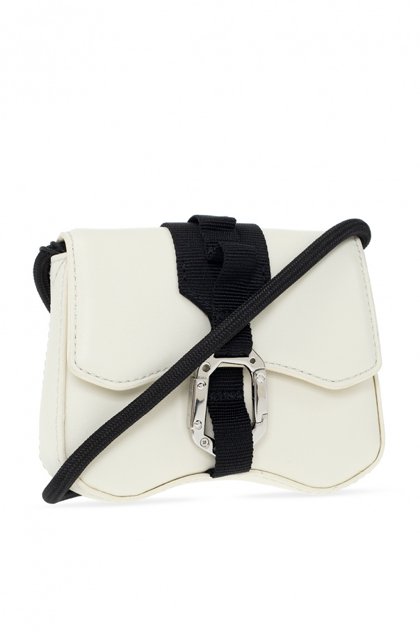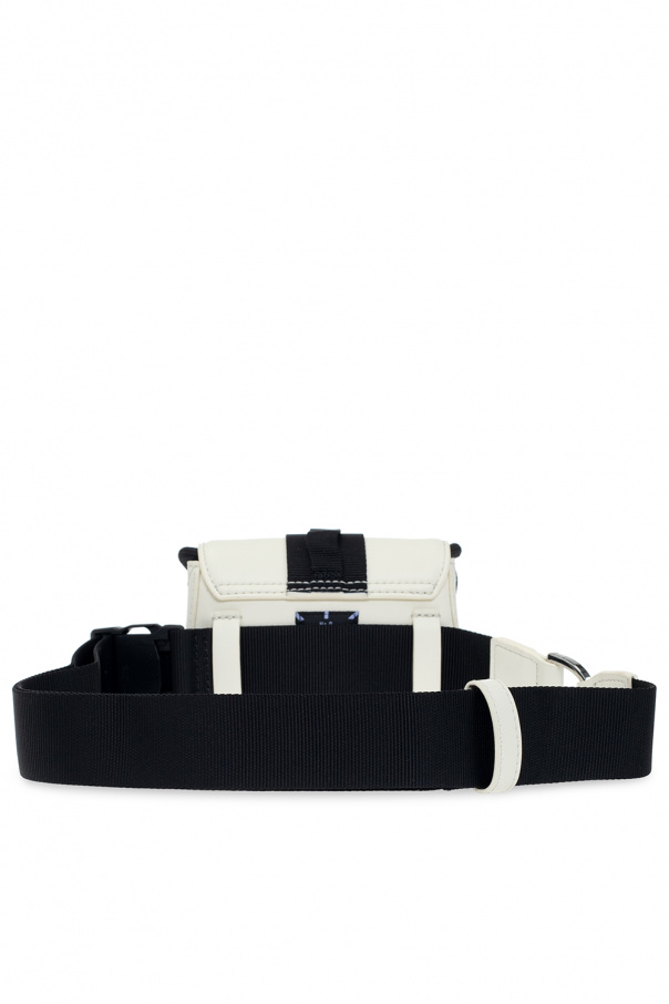 White and black belt bag from No. 0 by McQ. Crafted from recycled leather, this item features a magnetic snap and clip closure, detachable shoulder strap, silver-tone metal hardware and one internal compartment with one slip pocket.