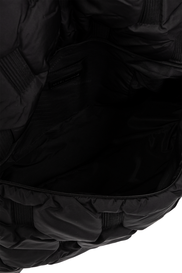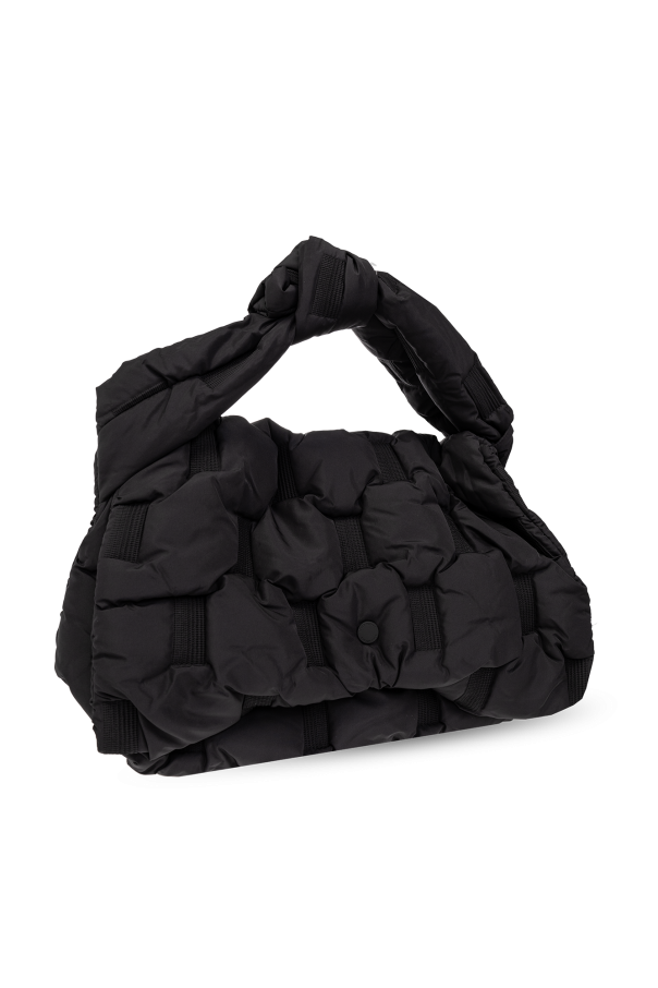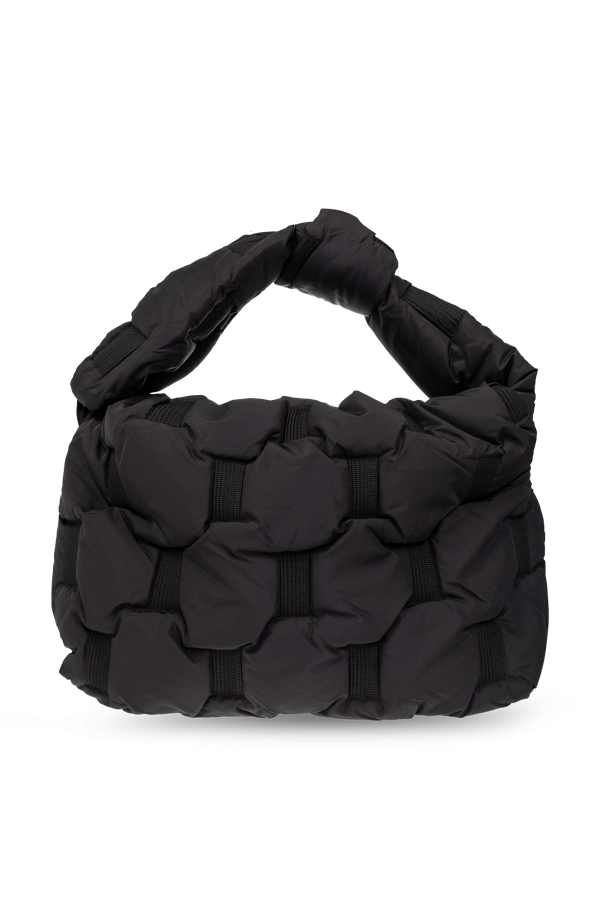 Black shoulder bag from Issey Miyake. Fastened with a magnetic snap button, this quilted design features an adjustable shoulder strap and an internal compartment with a zip pocket.