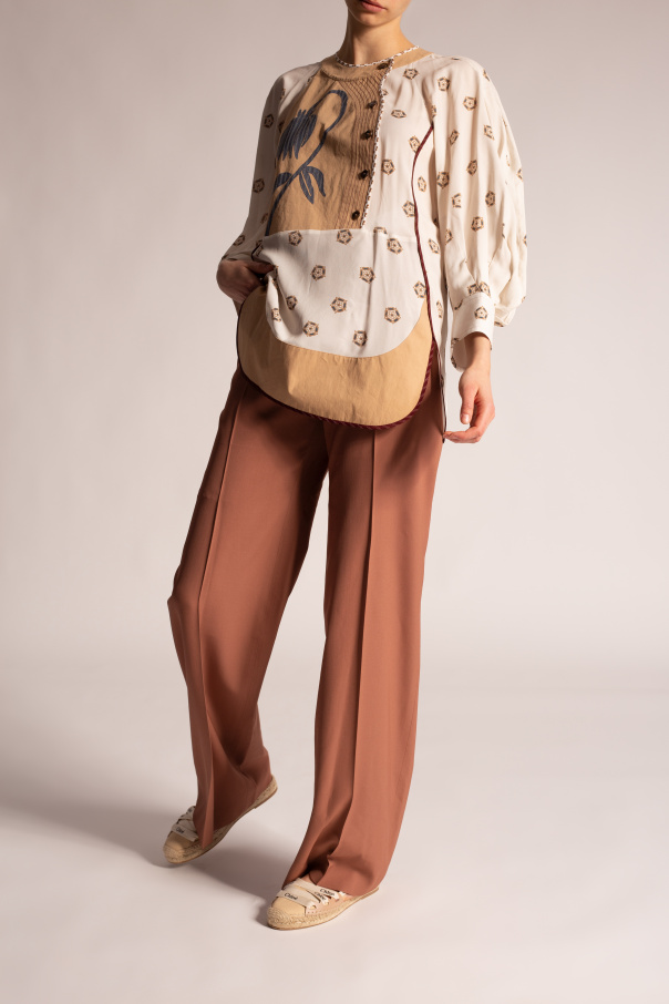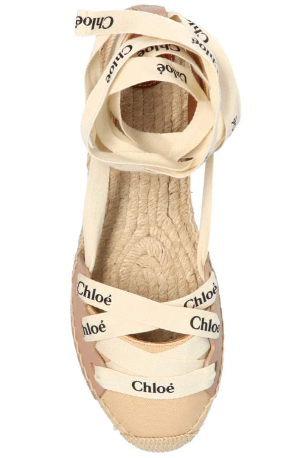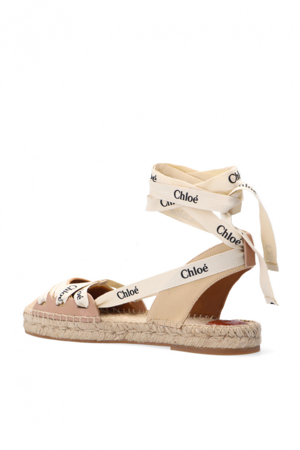 Cream espadrilles from Chloé. Made of fabric and leather, this pair sits on a brown rubber sole and features a lace-up fastening and a black logo print.
