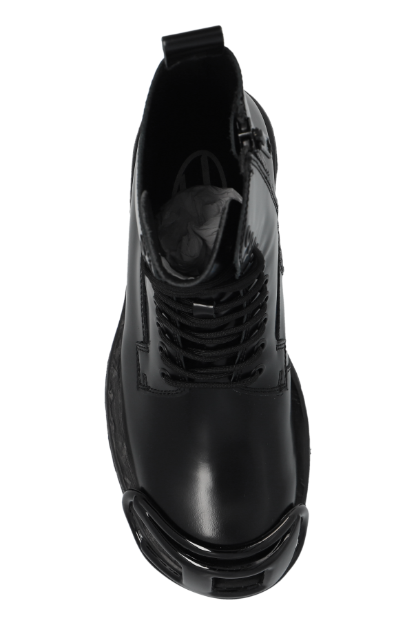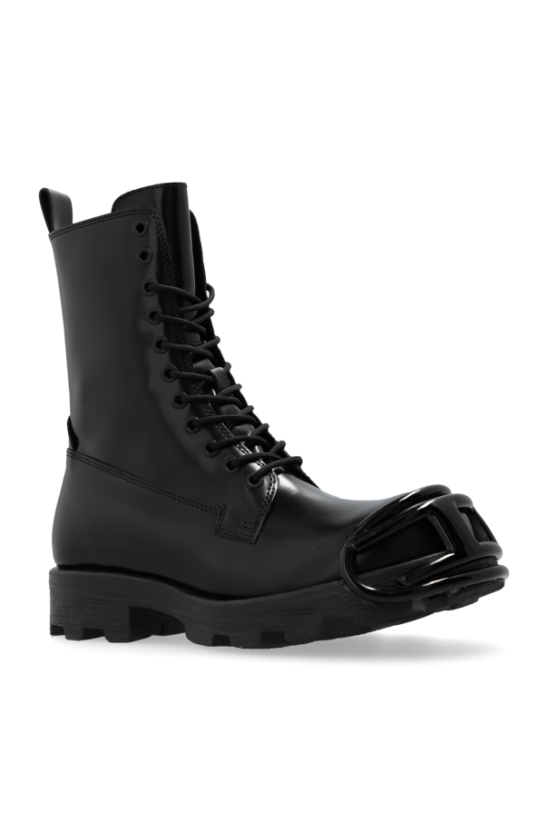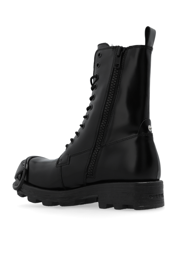 Introducing the D-HAMMER ankle boots from Diesel\'s exclusive collection, where timeless elegance meets robust design. These boots epitomize the perfect amalgamation of luxury and durability, making them an indispensable addition to any discerning wardrobe. Crafted from sleek, glossy leather, these boots feature a classic ankle-high silhouette reminiscent of military or work footwear, enhanced by a sturdy, thick rubber sole with a pronounced tread for exceptional grip. Their monochromatic black hue exudes sophistication, while the large, decorative buckle on the toe cap serves as a striking focal point. Functionality is seamlessly integrated with style, as evidenced by the side zipper for easy wear, front lacing for an adjustable fit, and a small heel tab to aid in pulling the boots on. The interior is thoughtfully lined to ensure unparalleled comfort during wear. Why Choose These Boots? Elegant Design: The sleek black leather and distinctive buckle offer a modern, refined look. Superior Comfort: Cushioned interior and adjustable lacing provide a customized fit. Durable Construction: High-quality leather and robust rubber sole ensure longevity. Versatile Style: Suitable for both casual and sophisticated ensembles. Effortless Wear: Side zipper and heel tab simplify putting on and taking off the boots.