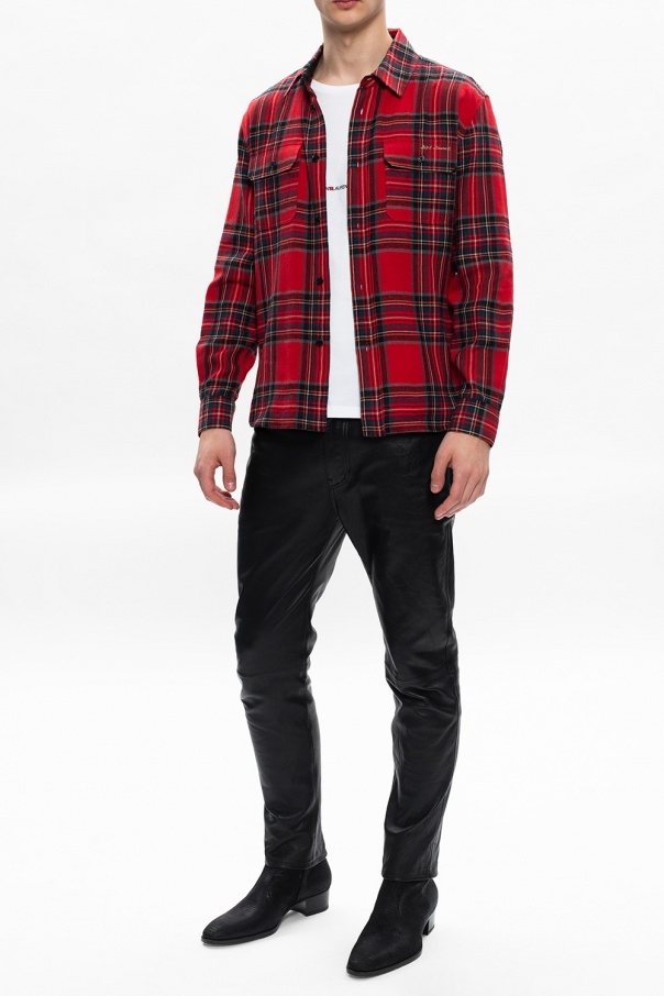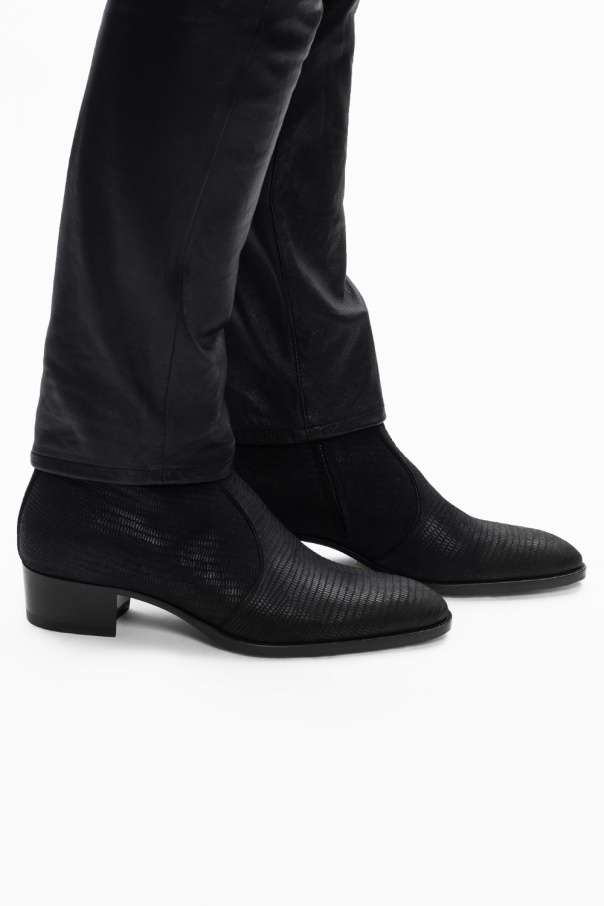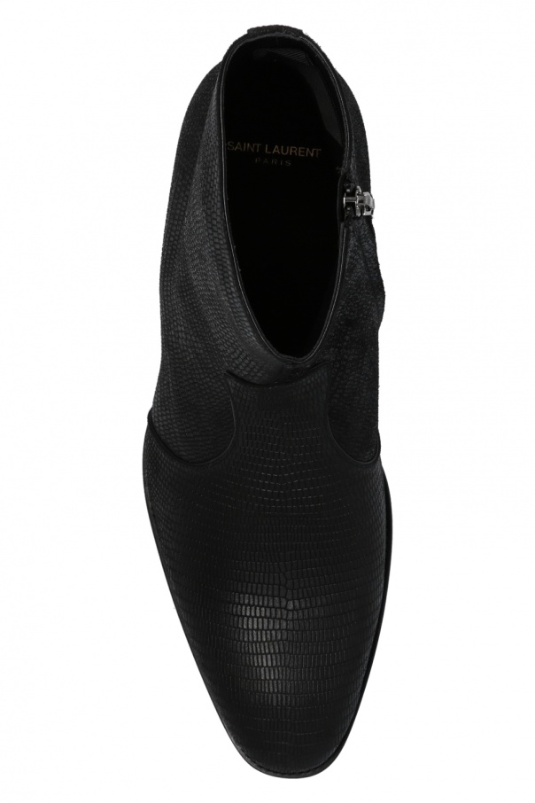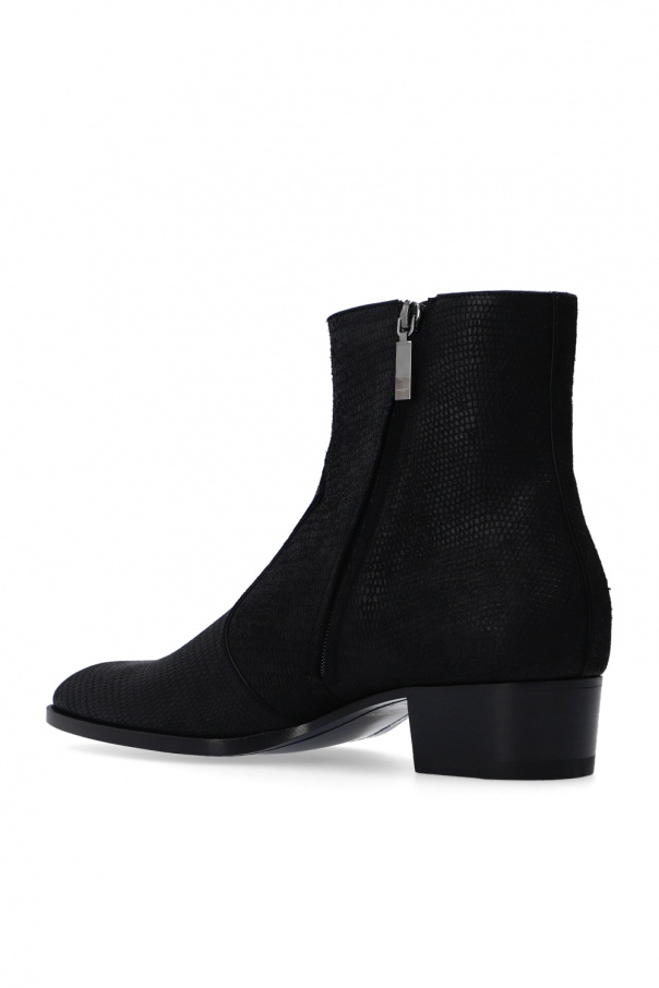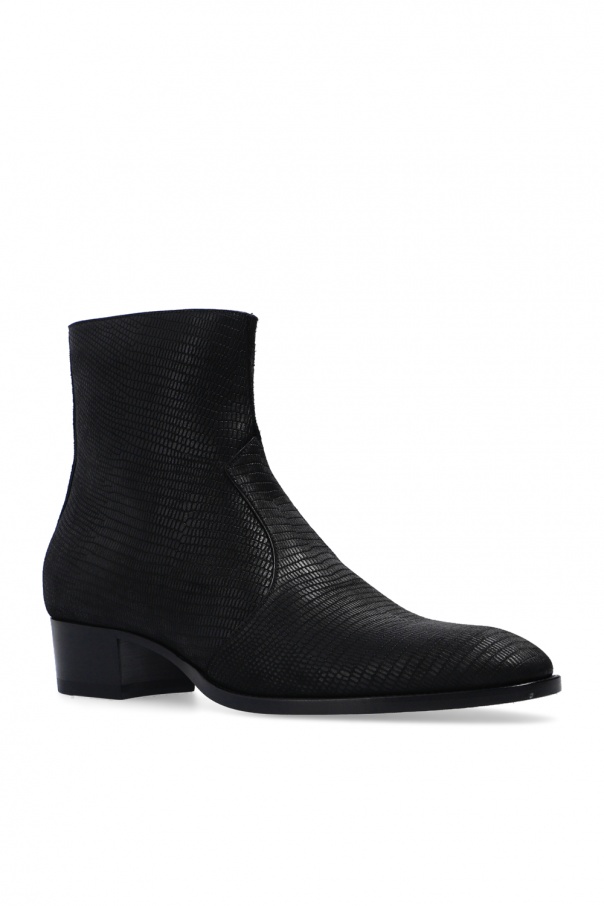 Black ‘Wyatt’ heeled ankle boots from Saint Laurent. Crafted from textured leather, this design features a side zip and a black leather sole.