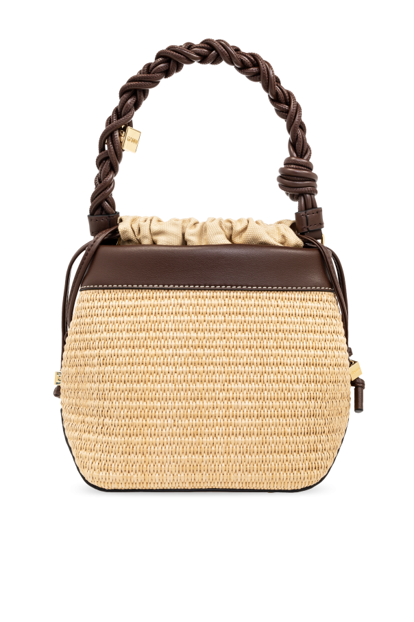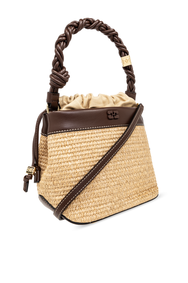 Introducing the Ganni Shoulder Bag, a masterpiece of craftsmanship and style that seamlessly blends functionality with high fashion. This exquisite piece, characterized by its beige and dark brown hues, is a standout accessory designed to elevate any ensemble. The bag\'s lower section features a textured, woven material, reminiscent of a chic basket weave, while the upper part is crafted from a smooth, leather-like fabric in a rich dark brown. The shape is elegantly rectangular with softly rounded edges, presenting a silhouette of sophistication and grace. Adorned with a twisted brown handle and a long, cross-body strap that boasts decorative contrast stitching, this shoulder bag marries aesthetic allure with practicality. The fringed edge at the opening adds a touch of casual elegance, and the bag\'s closure is ingeniously designed with a drawstring mechanism, ensuring your belongings are secure yet easily accessible. Gold metal accents, including clasps and strap ends, infuse the bag with a luxurious appeal. The interior, lined in a matching beige fabric, features a compartment for organized storage, complete with a brand label, affirming its quality and designer pedigree. Why Purchase This Product? Exclusive Ganni design, synonymous with luxury and refinement. Made from a blend of 50% Polypropylene, 40% Recycled Polyester, and 10% Cotton, offering durability and sustainability. Unique combination of materials and textures, providing both visual and tactile delight. Practical features like the internal compartment and secure drawstring closure, ideal for everyday use. Luxurious gold accents and logo detail, underscoring the bag\'s exclusivity.