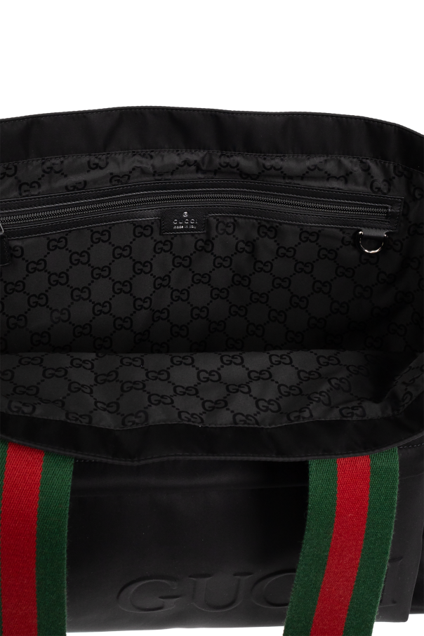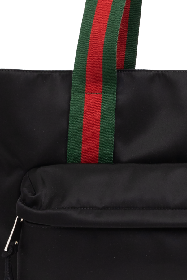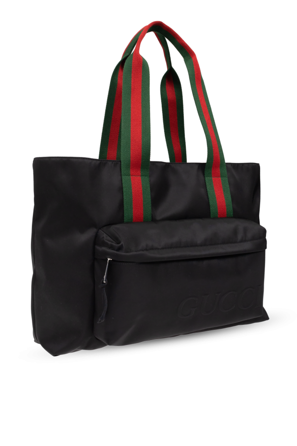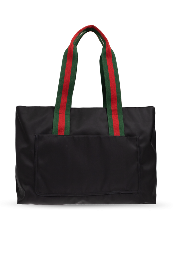 Introducing the Gucci Shopper Bag, a paragon of sophistication and utility from the esteemed fashion house. Crafted in exquisite black nylon, this bag epitomizes durability and style, making it a perfect companion for any occasion. Its signature green and red handles not only ensure comfort but also serve as a distinctive hallmark of the brand. The embossed logo adorning the front pocket exudes prestige and instant recognizability. For those who cherish practicality, the bag features a convenient external zippered pocket for smaller essentials. Inside, the lavishly lined interior, embellished with the brand\'s logo pattern, whispers luxury at every glance. Why Choose This Product? Iconic design by the visionary Alessandro Michele. Luxurious interior with a zippered compartment for organization. Timeless elegance combined with modern functionality. Part of the prestigious Kering luxury group.