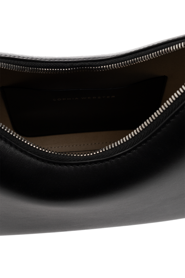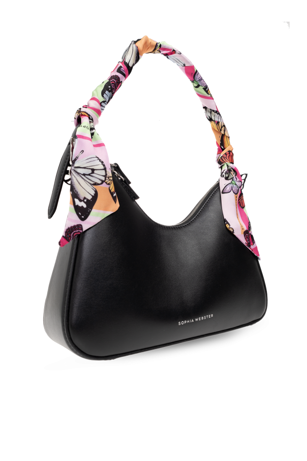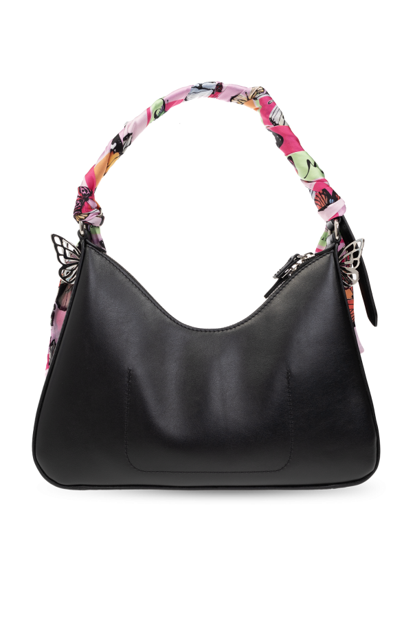 Black ‘Mariposa’ shoulder bag from Sophia Webster. Made of calf leather, this design fastens with a zip and showcases an embossed logo on the front and butterfly applications on the sides. It is complete with an adjustable handle accentuated with a colourful, butterfly-printed scarf, silver-tone metal hardware and one internal compartment with a slip pocket.