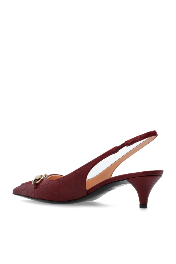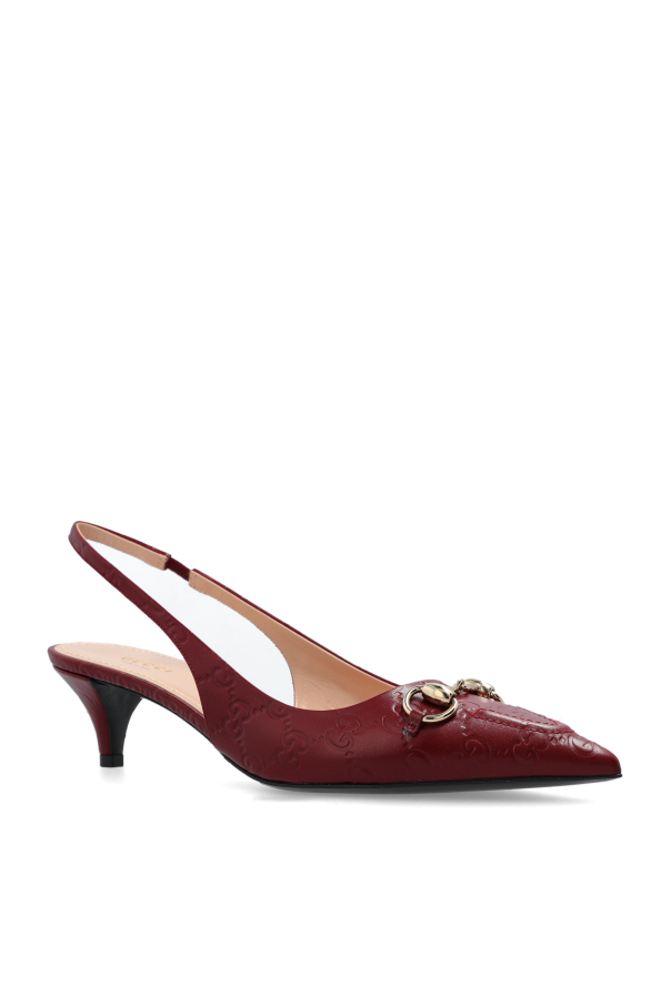 Experience the epitome of sophistication with our Gucci Leather Heels in a captivating burgundy hue. These heels boast a striking pointed toe and a gracefully slender kitten heel, offering an exquisite blend of elegance and comfort. Crafted from premium leather, these shoes feature intricate embossed patterns that elevate their luxurious appeal. The front is adorned with a golden metal buckle, a testament to refined craftsmanship. The slingback design with an open heel and ankle strap adds a contemporary twist, making them ideal for both formal occasions and chic casual ensembles. Inside, the golden designer logo serves as a signature of unparalleled quality. Why Choose This Product? Luxurious Gucci design by Alessandro Michele. Exquisite embossed leather craftsmanship. Versatile style suitable for various occasions. Iconic golden buckle detail.