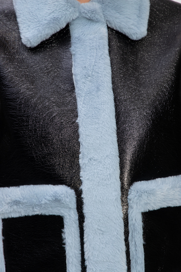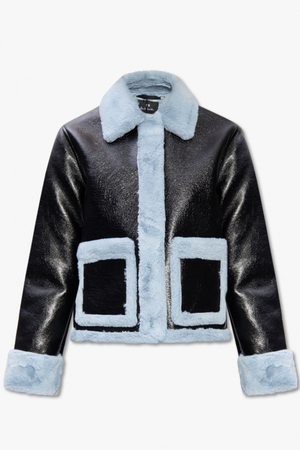 Black jacket from PS Paul Smith. Crafted from faux leather with a glossy trim, this style features snap fastenings, two frontal pockets, long sleeves and blue faux-fur trimming.