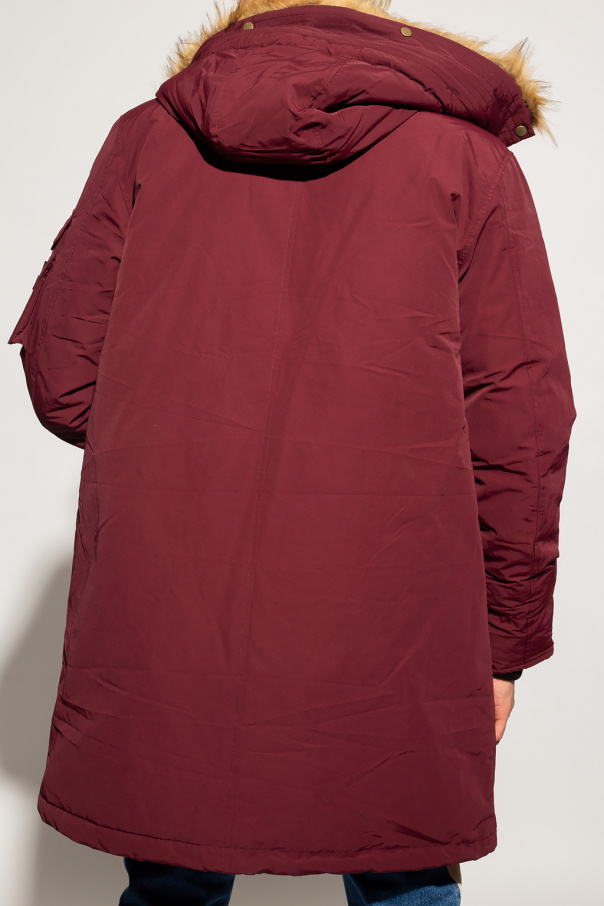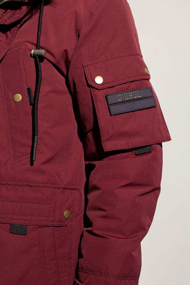 Maroon jacket from Diesel. Fastened with a zip and buttons, this garment features an embroidered logo pattern in grey, five snap-fastened pockets, two slip pockets, long sleeves with ribbed cuffs and a detachable faux fur trim at the hood.