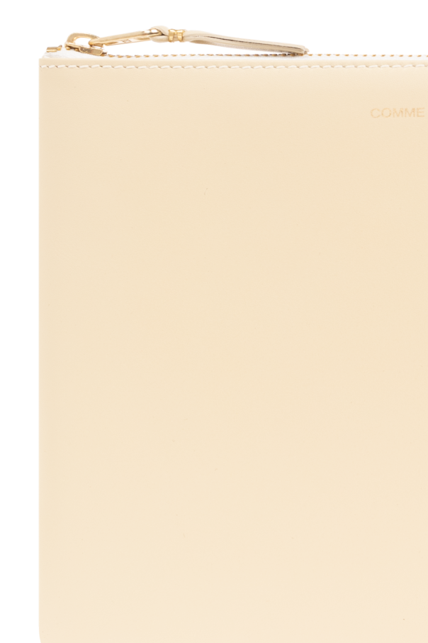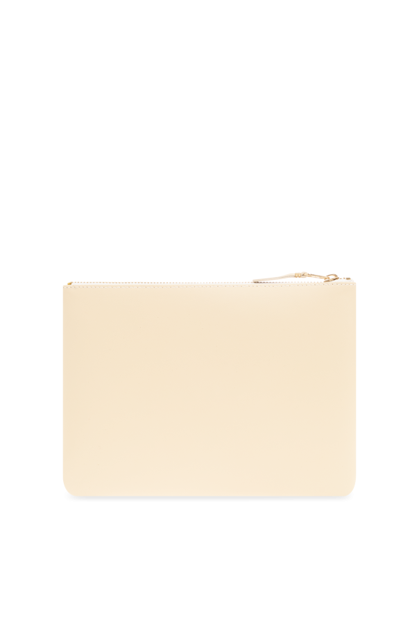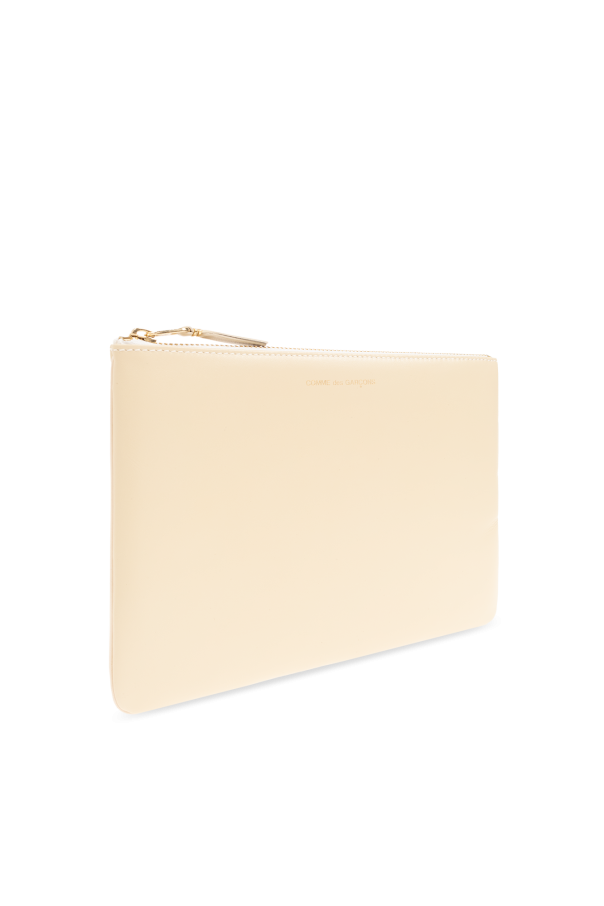 Cream pouch from Comme des Garcons. Made of leather, this item features a zip fastening, logo print, gold-tone metal hardware and one internal compartment.