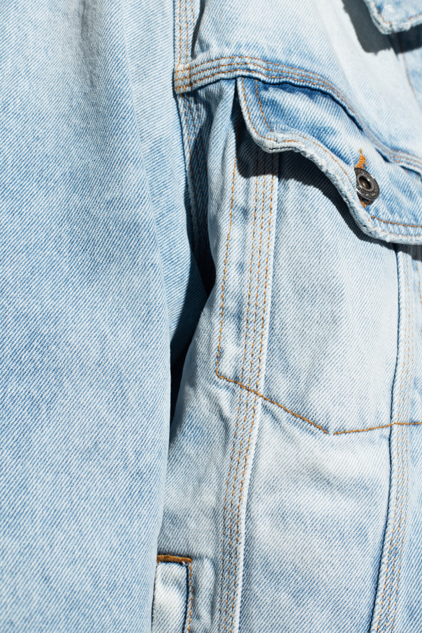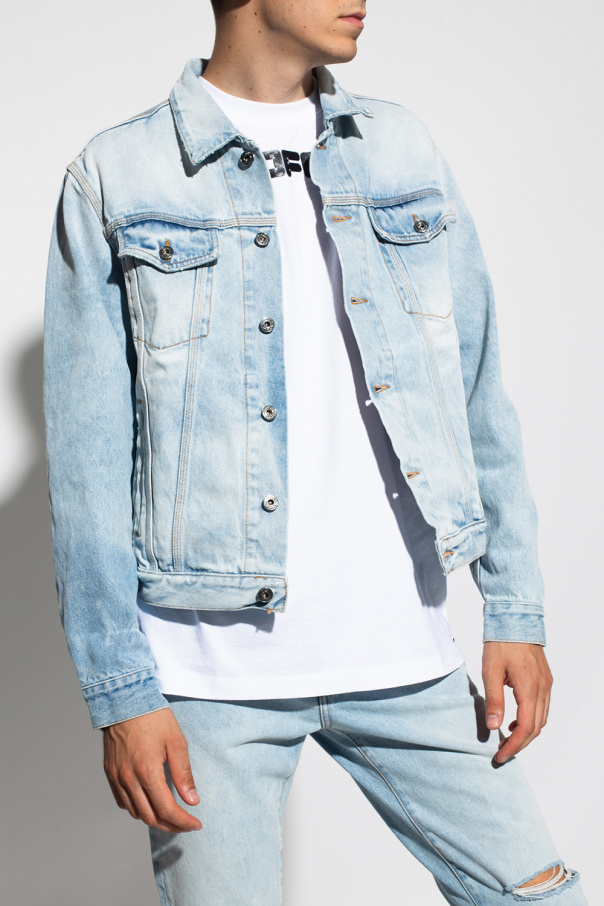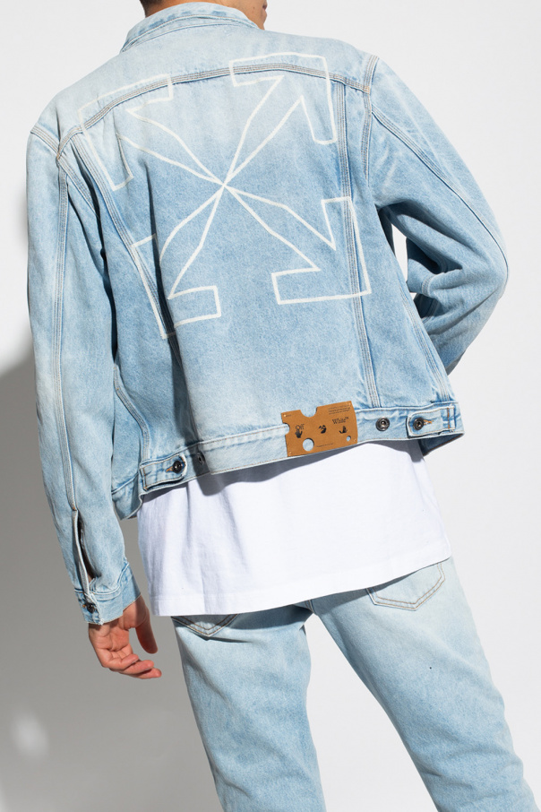 Light blue distressed denim jacket from Off-White. Fastened with buttons, this long sleeve design is complete with a logo embroidery, two slip pockets and two buttoned flap pockets.