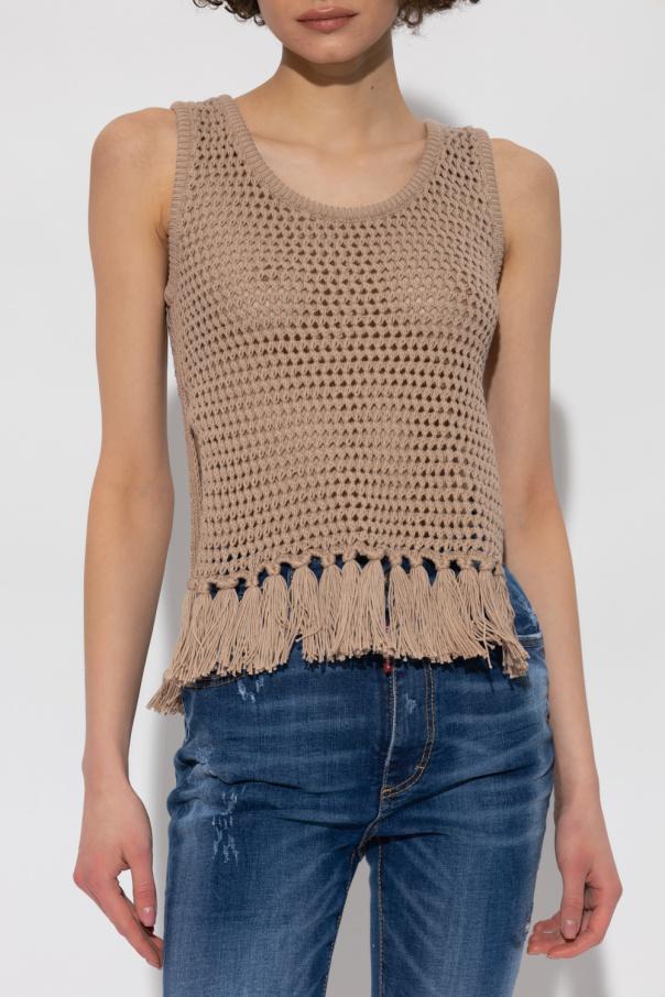 Greyish beige vest from Dsquared2. Made of cotton with a decorative knit, this design features a round neck, side vents and fringed hem.