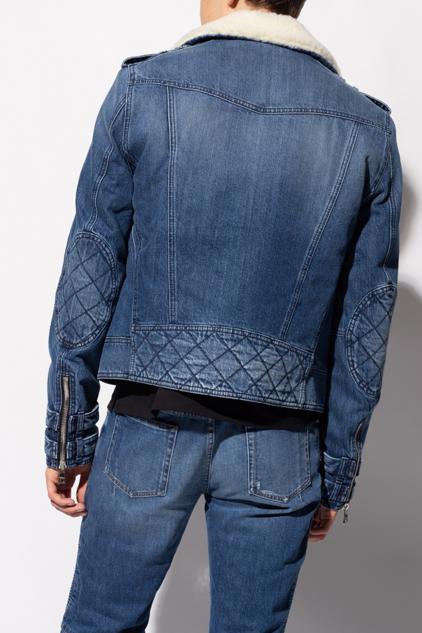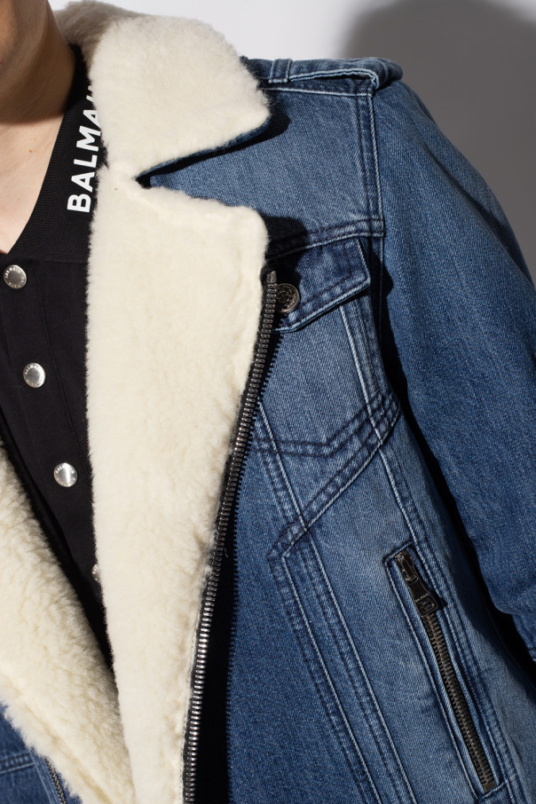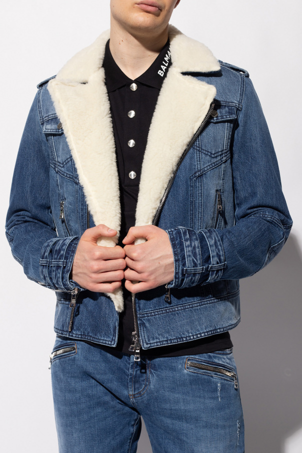 Blue denim jacket from Balmain. Trimmed with cream faux-fur on the collar and lining, this style features a two-way zip fastening, epaulettes on the shoulders, two zipped pockets and two flapped pockets with buttons on the front as well as long sleeves with zipped vents.