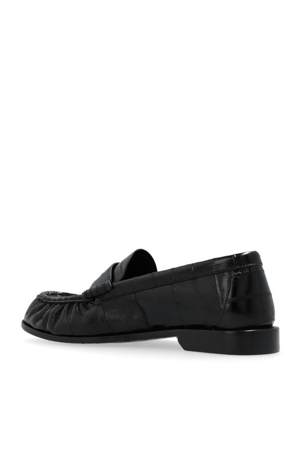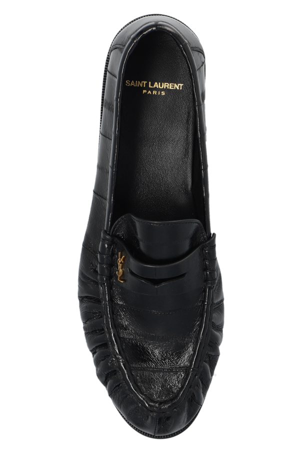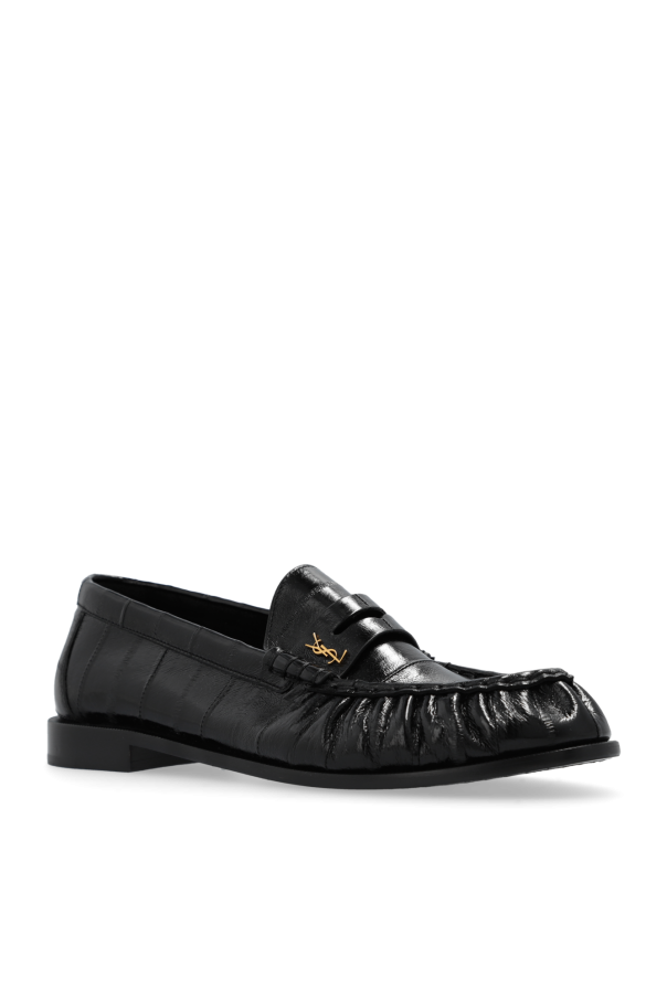 Black loafers from Saint Laurent. Made from textured leather, this model sits on a black leather sole and showcases a gold-tone logo application on the front.