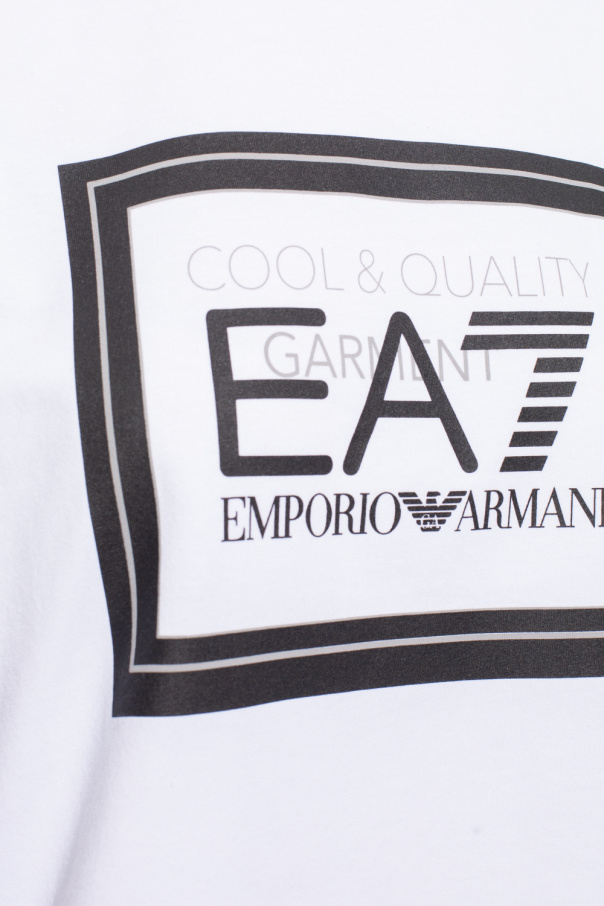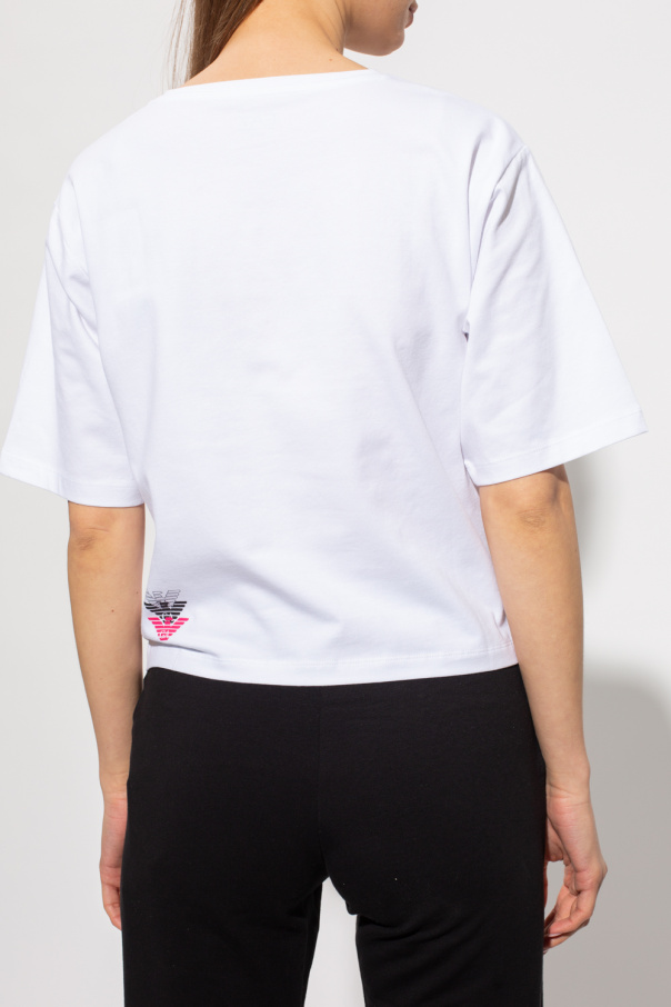 White T-shirt from EA7 Emporio Armani. Made of cotton, this short sleeve design features a ribbed crew neck and logo print in black, grey and pink.