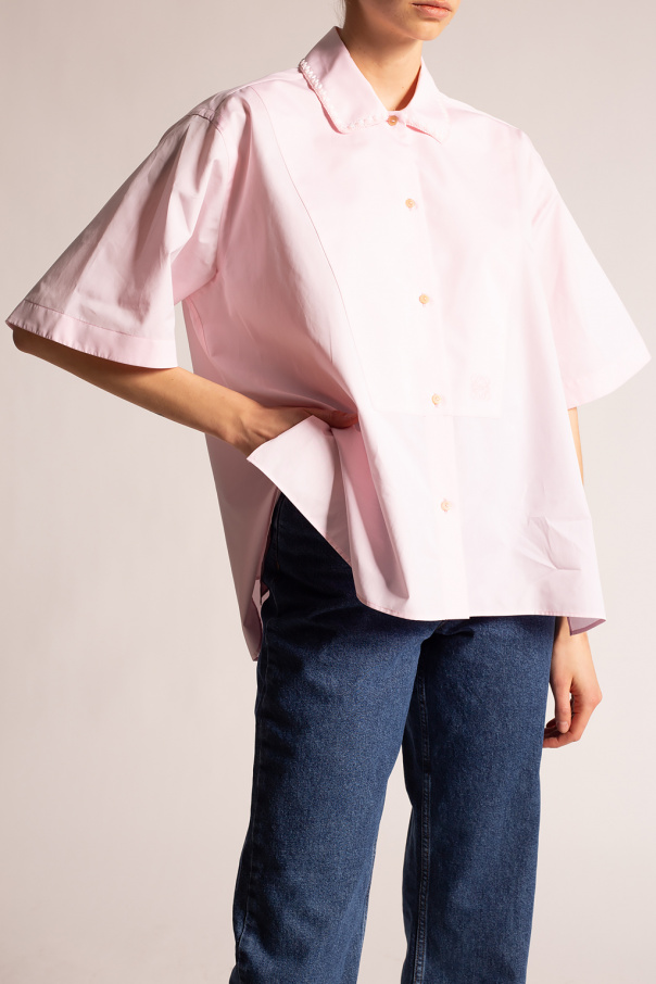 Light pink shirt from Loewe. Made of cotton, this style fastens via buttons and features short sleeves, white stitching details, an embroidered logo and side slits.