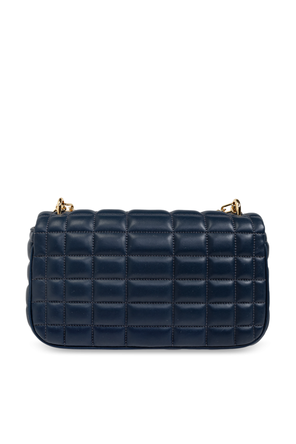 Introducing the Tribeca Shoulder Bag by the illustrious designer Michael Michael Kors. This exquisite accessory epitomizes sophistication and functionality, perfectly curated for the modern, discerning woman. The Tribeca features a sleek, rectangular shape with elegantly rounded corners, enveloped in a sumptuous navy blue leather. The distinctive quilted square pattern imparts a refined, textured allure, ensuring it stands out in any ensemble. Adorning the front is a resplendent gold-tone turn-lock clasp, emblazoned with the designer\'s iconic logo, reinforcing the bag\'s authenticity and prestige. The strap, a harmonious blend of leather and gold-toned chain, accentuates its opulent aesthetic. Inside, the bag is lined with a luxurious fabric, featuring a spacious compartment and a handy slip pocket, making it as practical as it is stylish. The magnetic closure ensures your essentials are securely stored yet easily accessible. Why Choose This Product? High-Quality Materials: Crafted from premium leather and luxurious fabric. Elegant Design: Quilted pattern and gold-tone accents for a timeless look. Spacious and Functional: Ample room with an internal compartment and slip pocket. Authenticity: Features the designer\'s logo on a gold-tone clasp. Versatile: Classic navy color complements a variety of outfits.