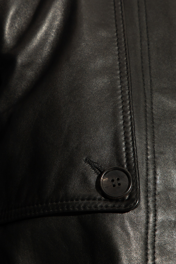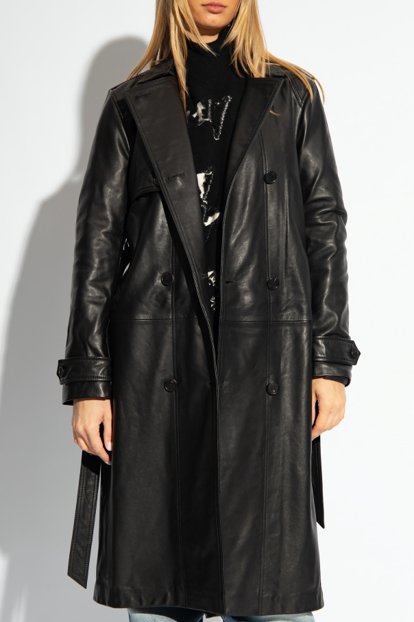 Black ‘Okena’ coat from AllSaints. Made of sheep leather, this style is cinched with a tie belt at the waist and features button fastenings, two slip pockets and long sleeves.