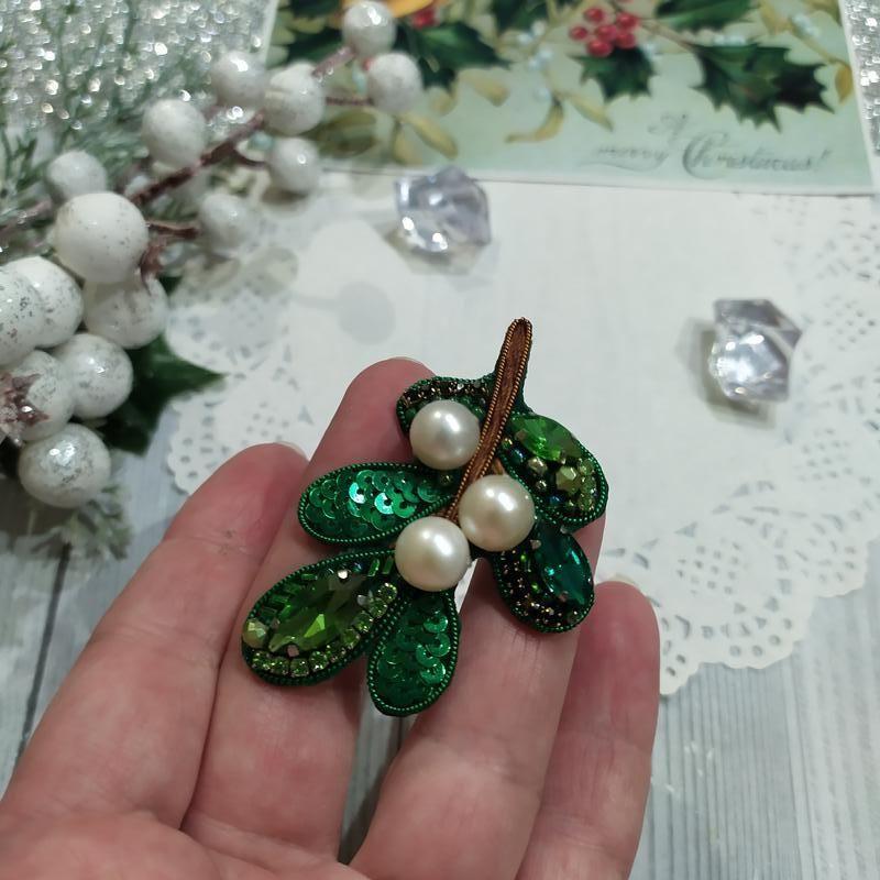 Брошь в виде веточки омелы вышита канителью,натуральным пресноводным жемчугом, пайетками, кристаллами. Изнанка декорирована натуральной кожей.