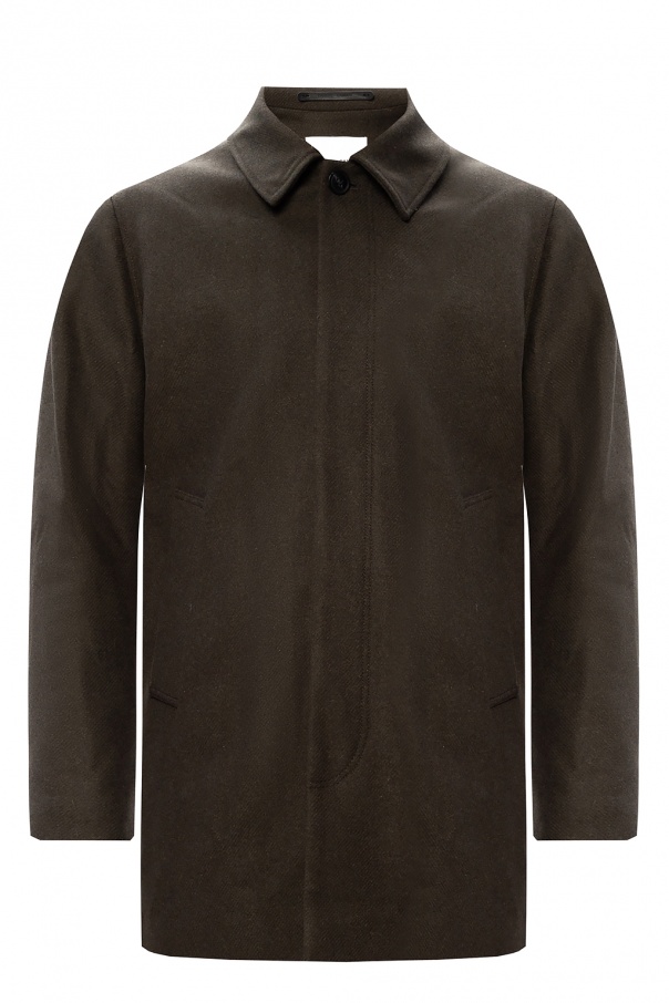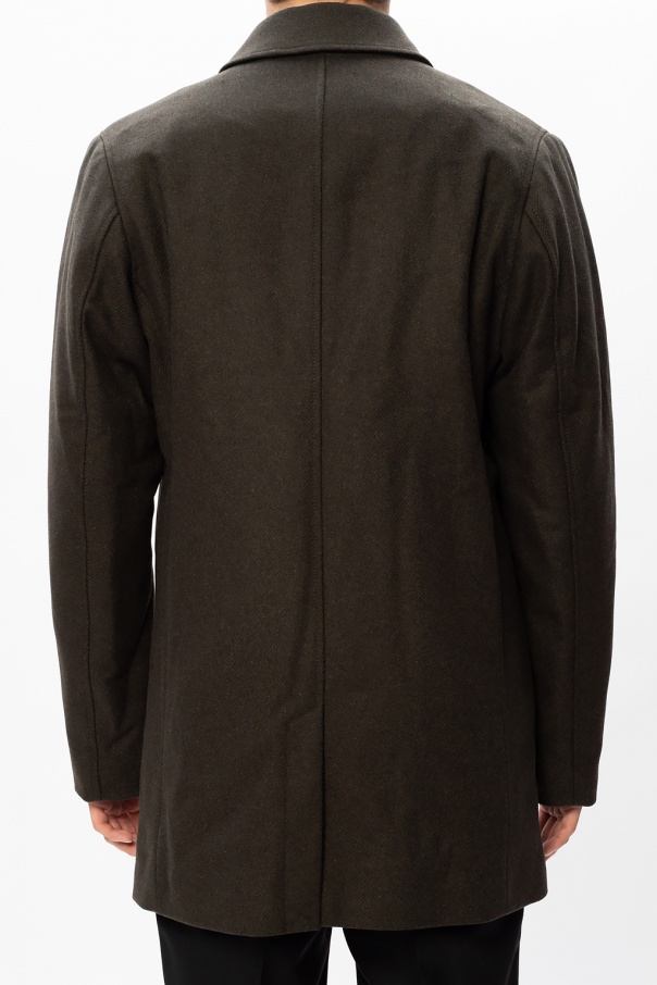 Green coat from Samsoe Samsoe. Crafted in wool, this piece of outerwear features single-breasted design with mid-length, button fastening, two jetted pockets on the front and single vent on the back.