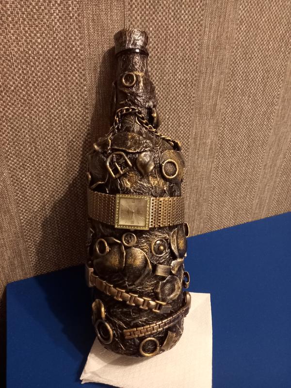 Пляшка декорована своїми руками. Можна використати за призначенням. Гарний подарунок як чоловіку, так і жинці.