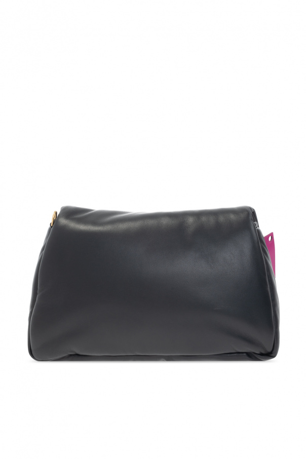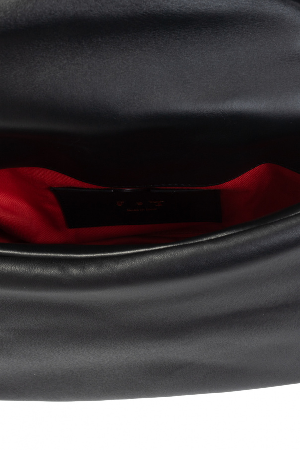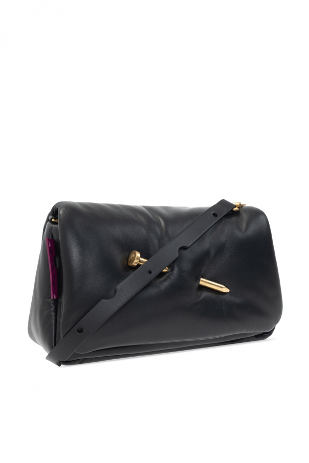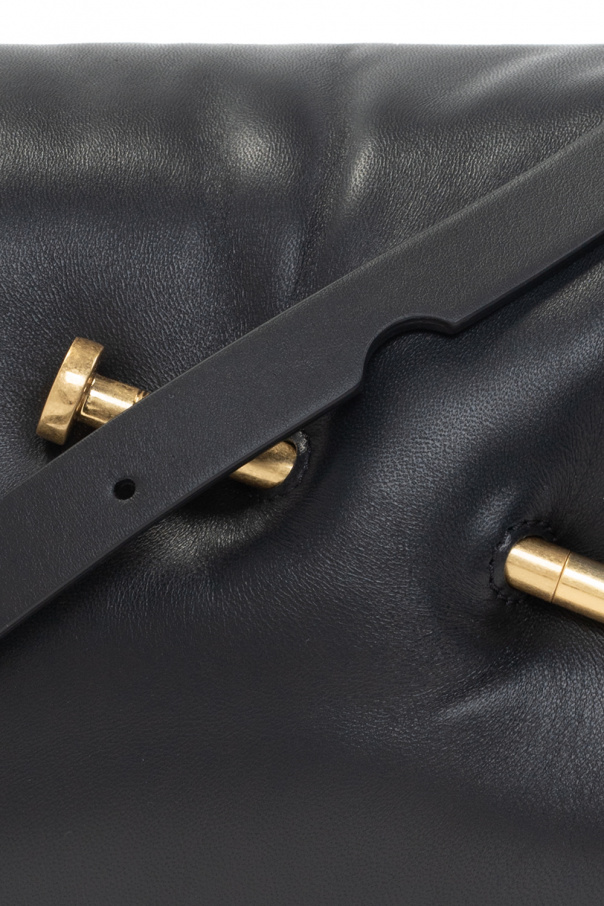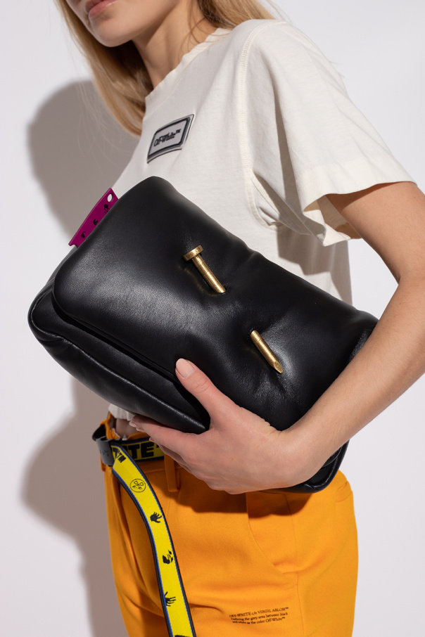 Black ‘Nailed’ handbag from Off-White. Crafted from calf leather, this model features a fold-over top with magnetic snaps, a metal nail appliqué, logo patch on the side and detachable strap in gold-tone.