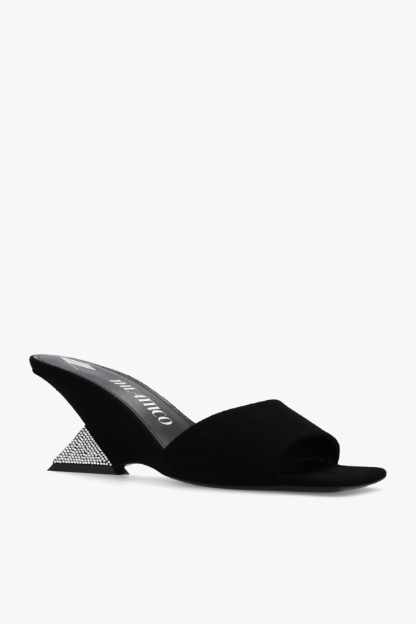 Black ‘Cheope’ heeled mules from The Attico. Made of suede, this pair features a square toe, decorative heel embellished with crystals and black leather sole.