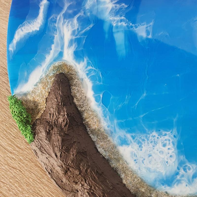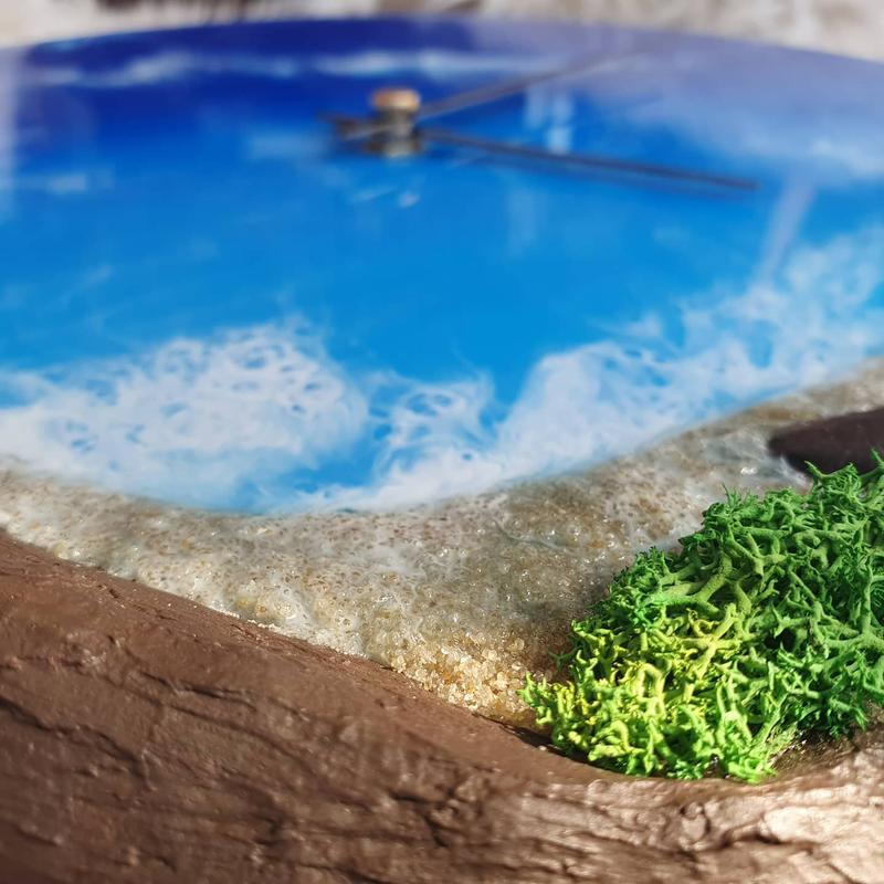 Полностью ручная работа. Морские часики выполнены в технике resin art (эпоксидная смола) с объёмными горами и песочным побережьем, декорированы мхом.
