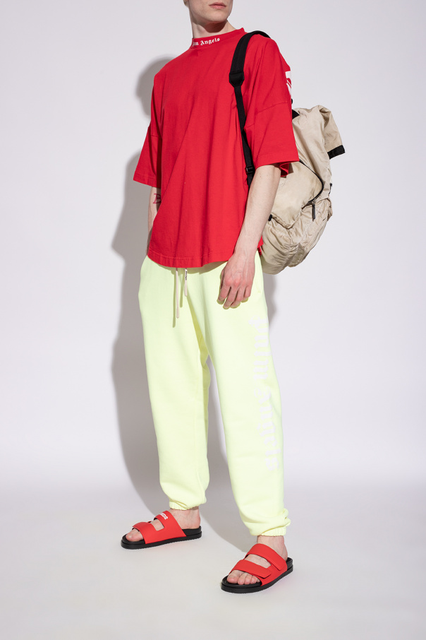 Red slides from Dsquared2. Made of leather, this model sits on a black rubber sole and showcases two velcro straps and a white logo print for brand recognition.