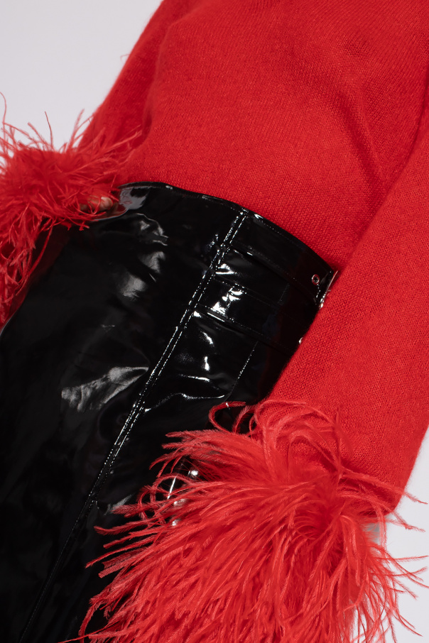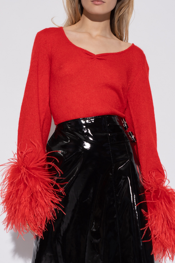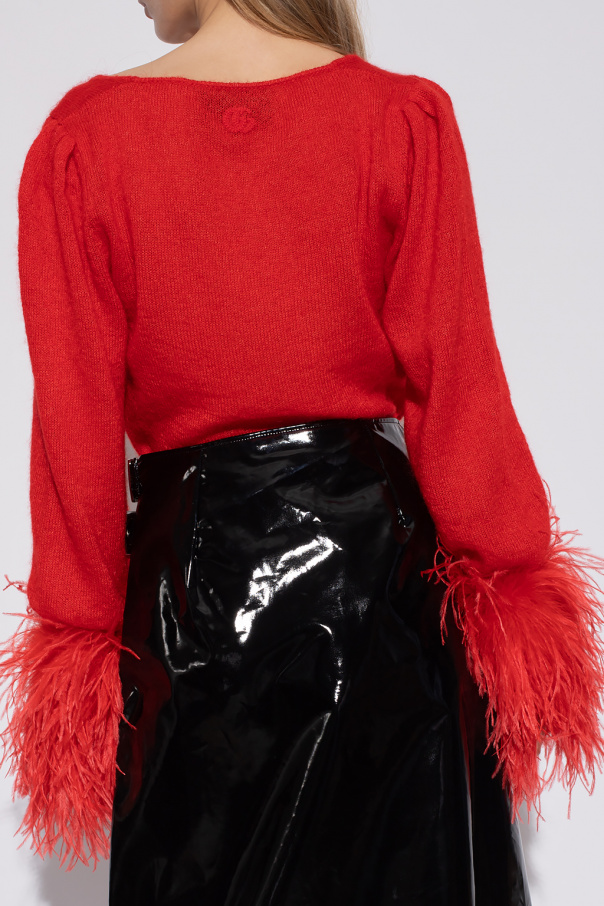 Red sweater from Gucci. Crafted from a mohair blend, this style features monogram embroidery on the back, an elasticated bottom hem and long sleeves with detachable ostrich feathers applications on the cuffs.