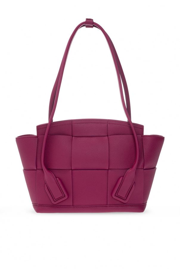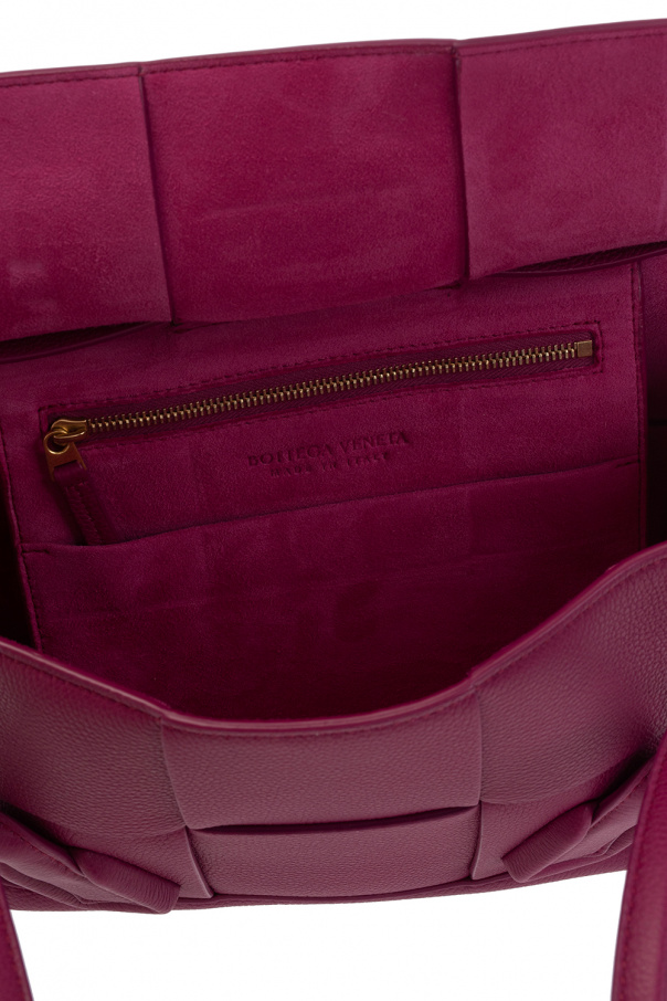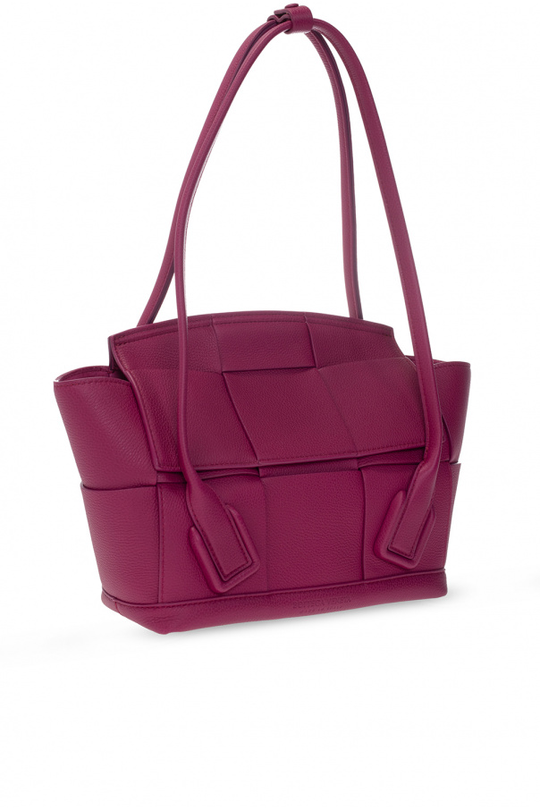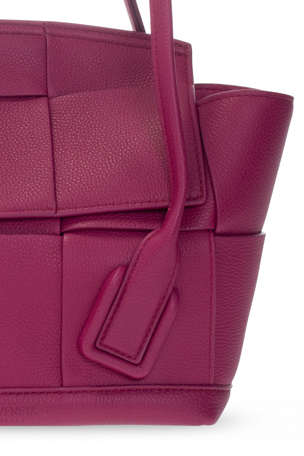 Dark pink ‘Arco Small’ handbag from Bottega Veneta. Crafted from calf leather, this design showcases the brand's iconic Intrecciato weave, two half-round handles with optional snap closures, gold-tone metal hardware and one internal compartment with one slip pocket and one zip pocket.