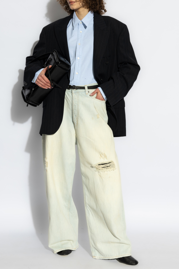 Introducing the Balloon Jeans by Acne Studios, a paragon of contemporary sophistication. These light blue jeans are meticulously crafted from 100% cotton, embodying a non-stretch, classic rigidity that accentuates their distinctive balloon silhouette. The wide legs taper gracefully towards the ankle, while artful distressing adorns the fabric, infusing a fashionable, worn-in aesthetic. Featuring a traditional button and zip closure at the waist, these jeans are both stylish and functional. Their five practical pockets, including two at the back, offer ample space, while the contrasting stitching adds a touch of character. Why Choose This Product? Exquisite Design: Unique balloon shape with artful distressing. Premium Material: Crafted from 100% pure cotton. Functional Elegance: Five pockets for practicality. Distinctive Style: Contrasting stitches for added flair.
