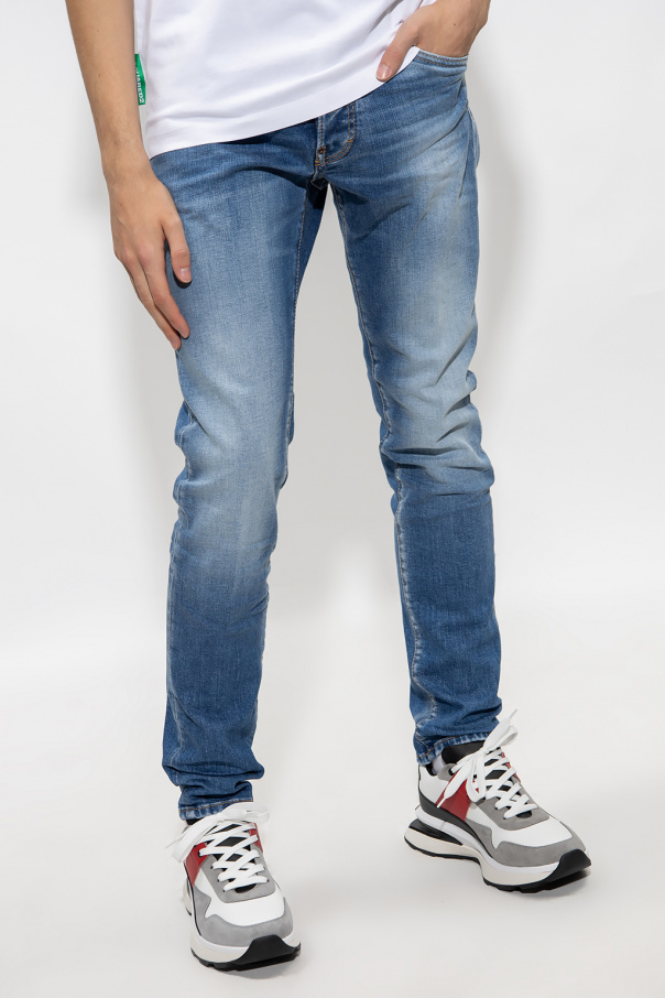 Blue ‘Cool Guy’ jeans from Dsquared2, the ‘One Life One Planet’ collection. Falling with slightly tapered legs, this pair features a low-rise waist, button closures and classic five pockets.