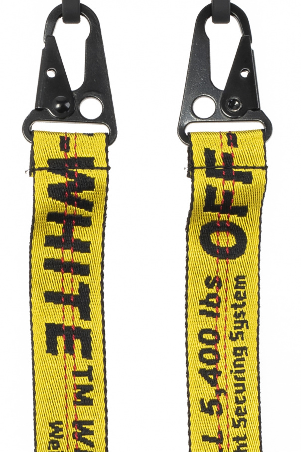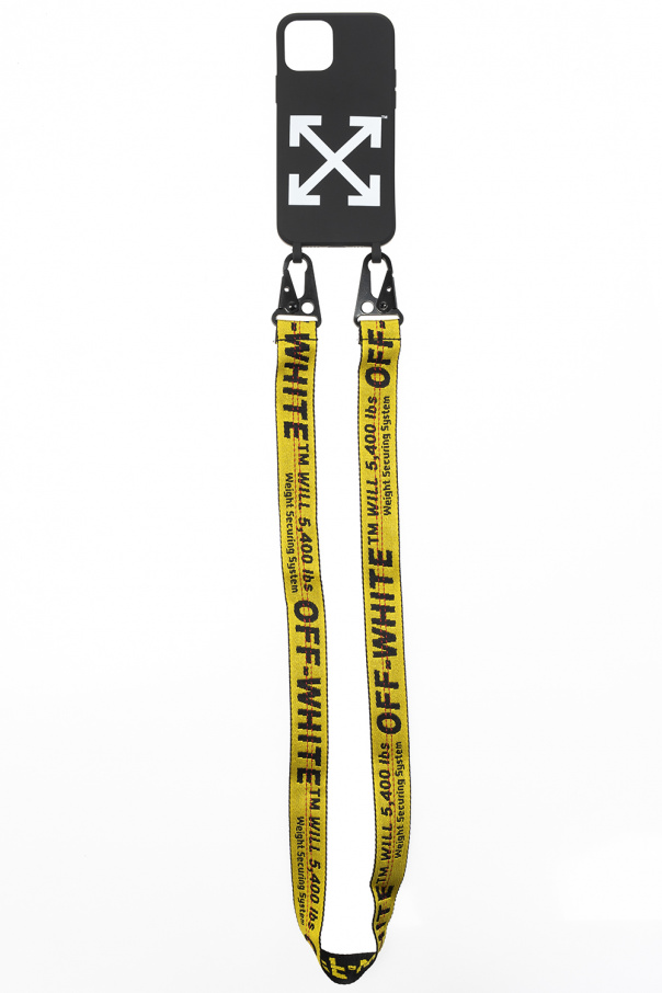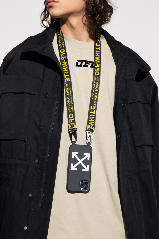 Black iPhone 12/12 Pro case with a white logo detail and detachable black strap embroidered with a yellow logo from Off-White.