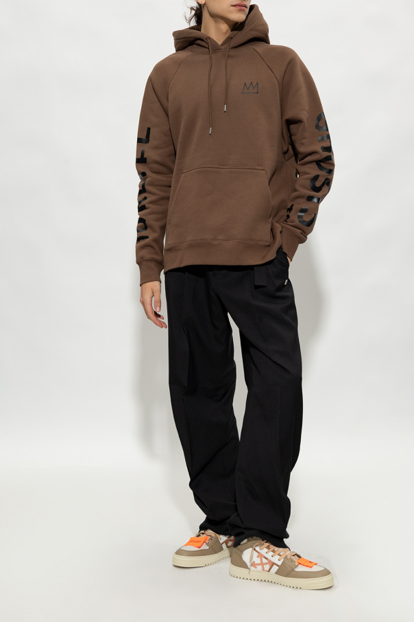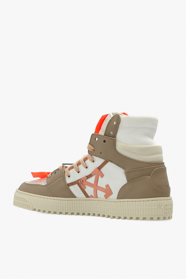 White and brown ‘3.0 Off Court’ from Off-White. Trimmed with leather, this lace-up pair features neon tongue patches, the brand’s signature dark green zip tie and cream rubber sole.