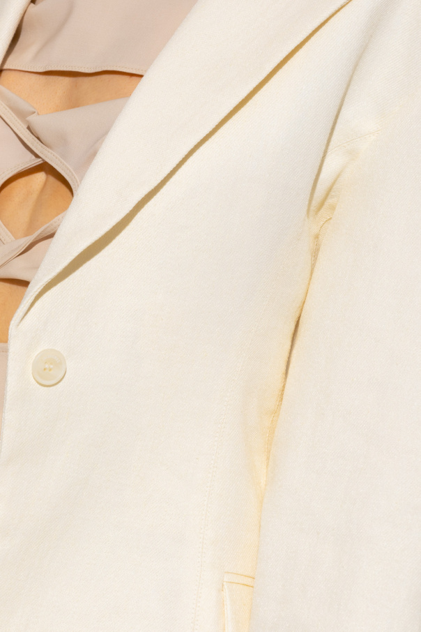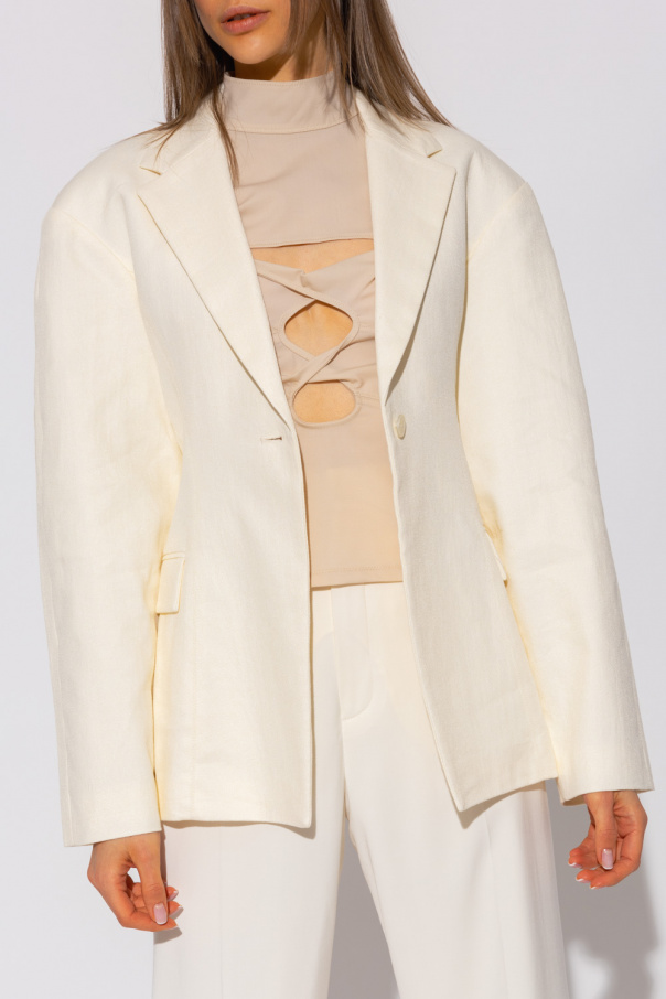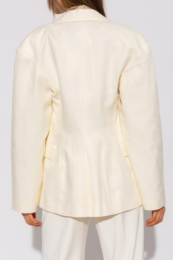 Cream single-breasted blazer from Jacquemus. With a tailored fit, this style features button fastenings, exaggerated shoulders, notch lapels, two flapped pockets, long sleeves and a single back vent.
