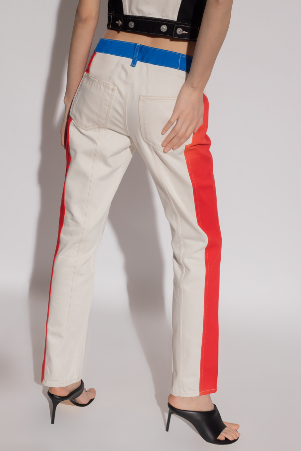 Cream, red and blue ‘2002’ low rise jeans Diesel. Fastened with a button and zip, this design features a red anagram embroidery, five slip pockets and straight legs.