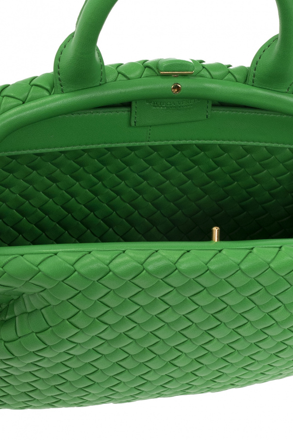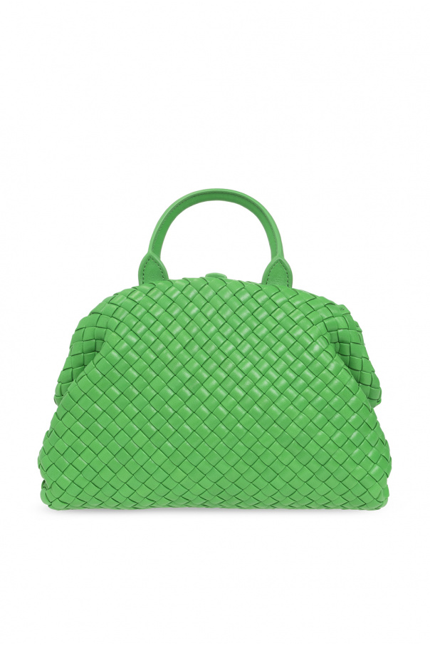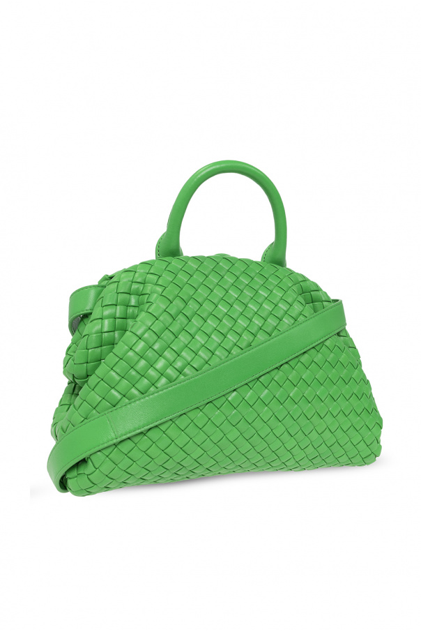 Green ‘Handle Small’ shoulder bag from Bottega Veneta. Crafted from lamb leather with the label’s signature Intrecciato weave, this model features a snap closure, detachable shoulder strap, one internal compartment and gold-tone metal hardware.