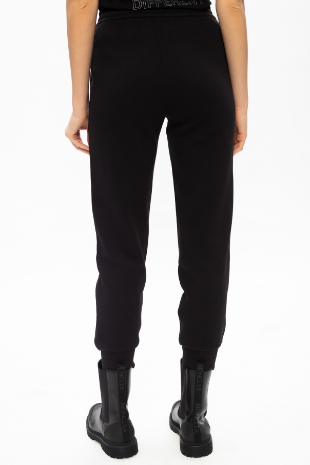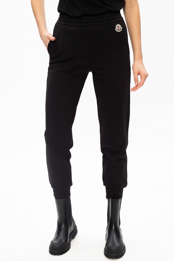 Black sweatpants from Moncler. Crafted from cotton, this design features a drawstring fastening, two slip pockets, ribbed cuffs and a logo patch in cream, navy and red.