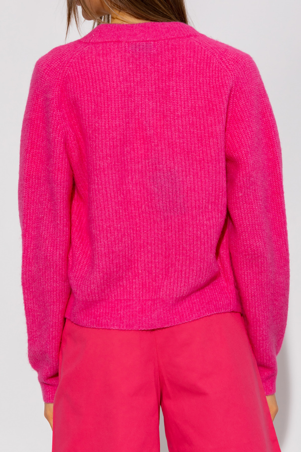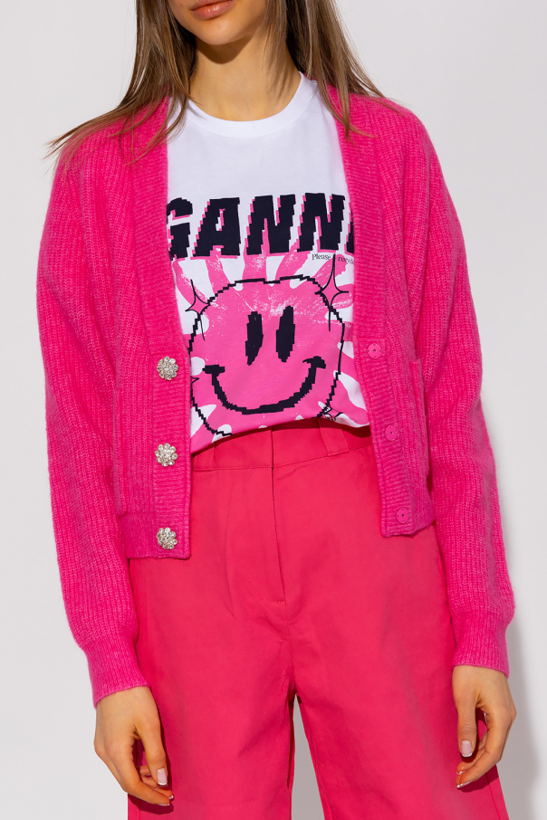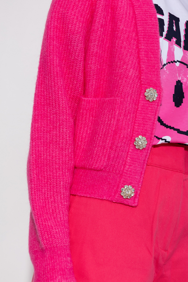 Pink V-neck cardigan from Ganni. Made of a wool blend, this garment features decorative buttons embellished with crystals, two front pockets and ribbed trims at the hem and cuffs.