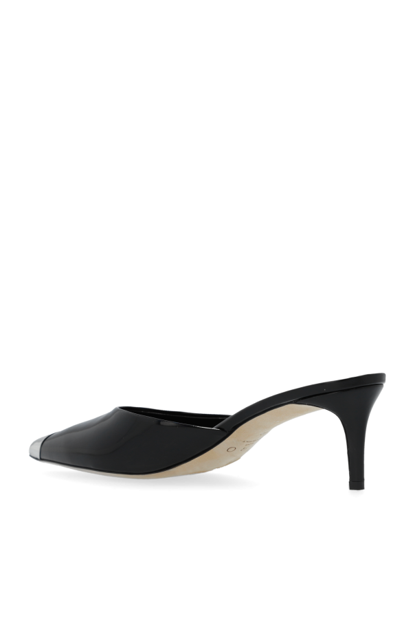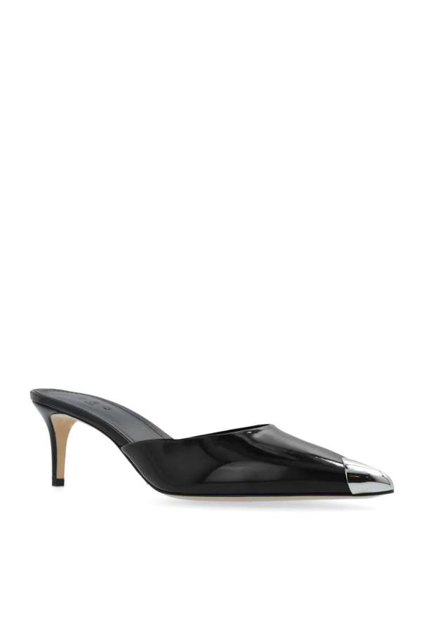 Black ‘Kaia’ mules from Iro. Made from patent leather with a holographical effect, this model sits on a light beige leather sole and features a pointed toe accentuated with a silver-tone metal application.