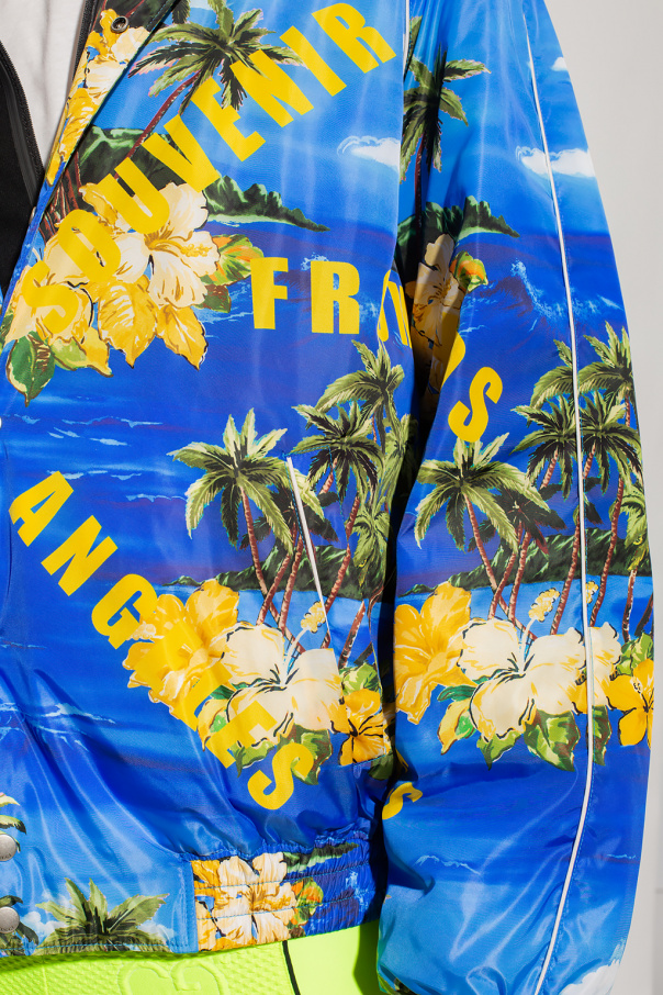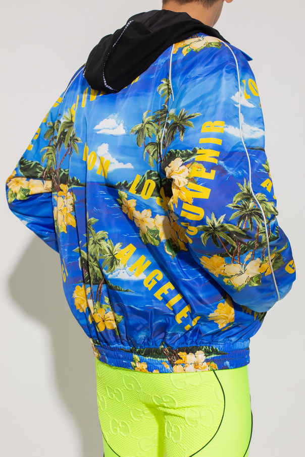 Blue, insulated jacket from Gucci. Enriched by a colourful Gucci souvenir from Los Angeles pattern, this style features snap fastenings, two slip pockets and an elasticated bottom hem and cuffs.