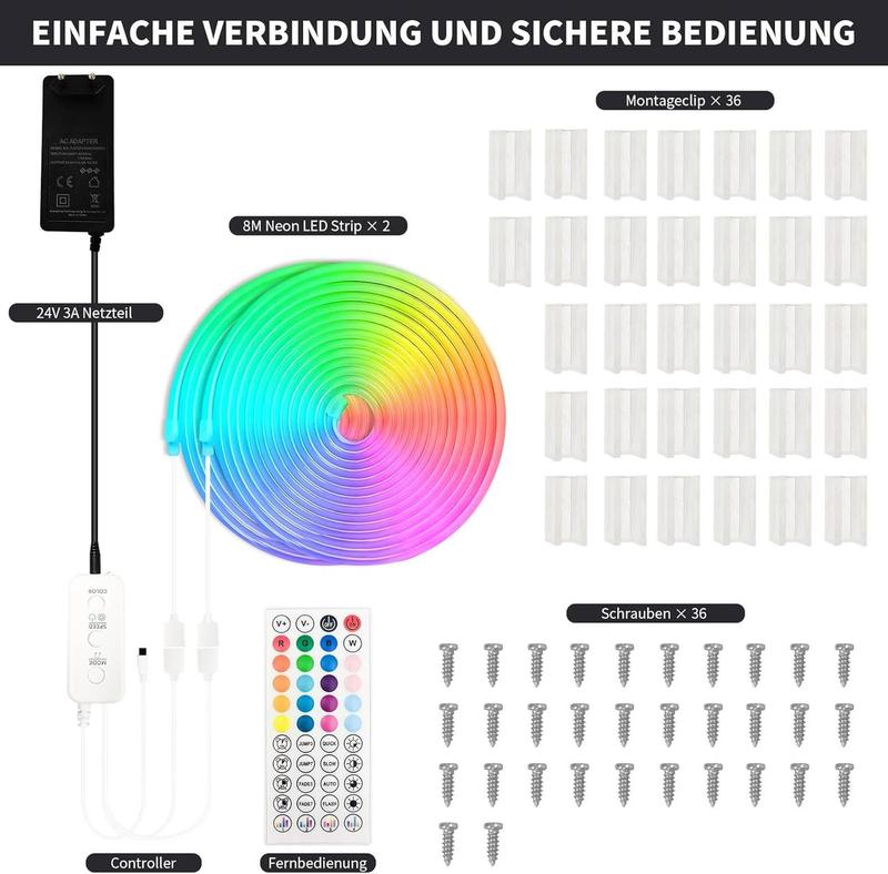 внутрішнього та зовнішнього використання 2 рулони [Клас енергії F]Динамічна та барвиста: 16-метрова неонова світлодіодна стрічка з технологією