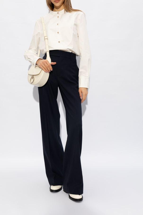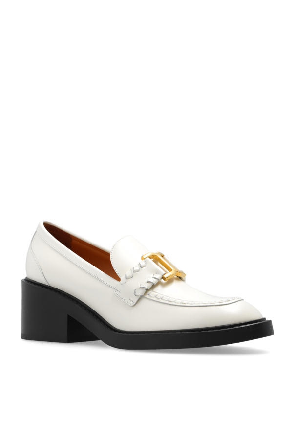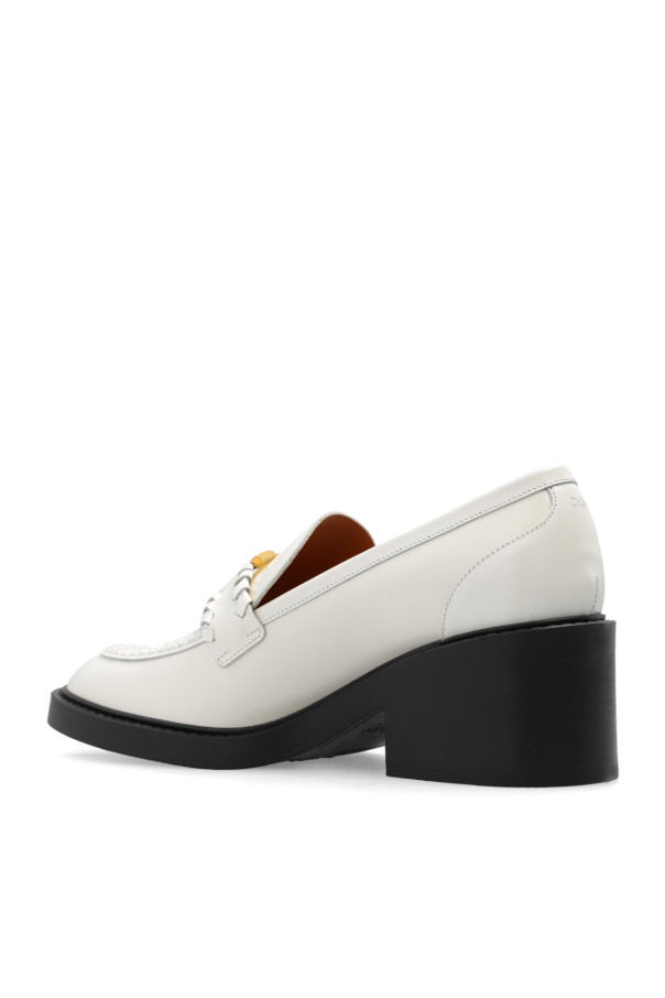 Cream ‘Marcie’ pumps from Chloe. Made of leather with a round toe, this model sits on a black rubber sole and showcases a strap with a logo buckle.