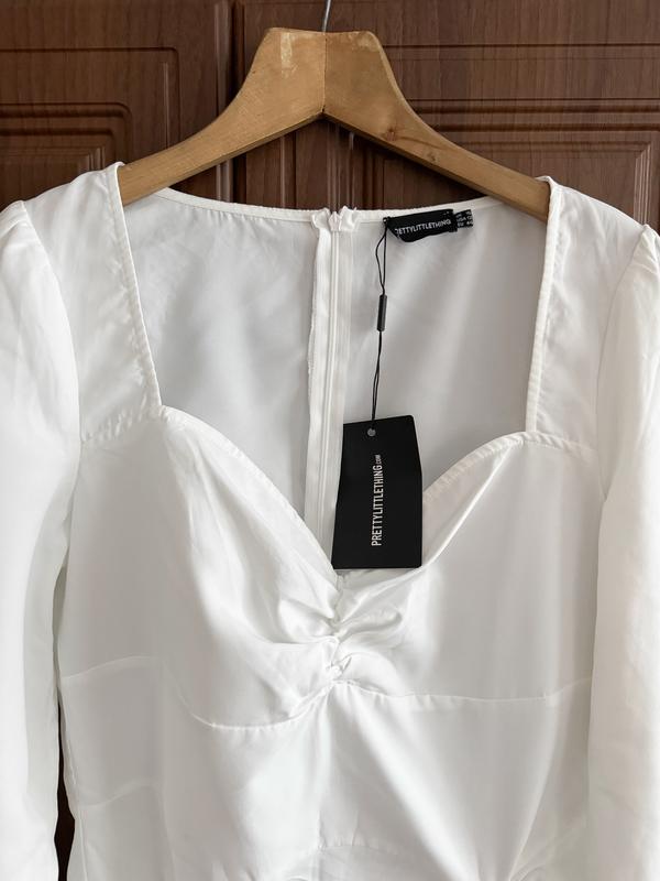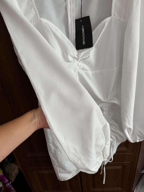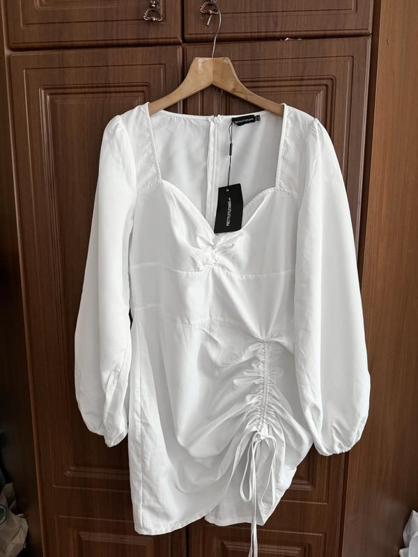 Белое платье с объемными рукавами, размер л-мин. Длина 90, пог 51, пот 44, есть стяжка по боку