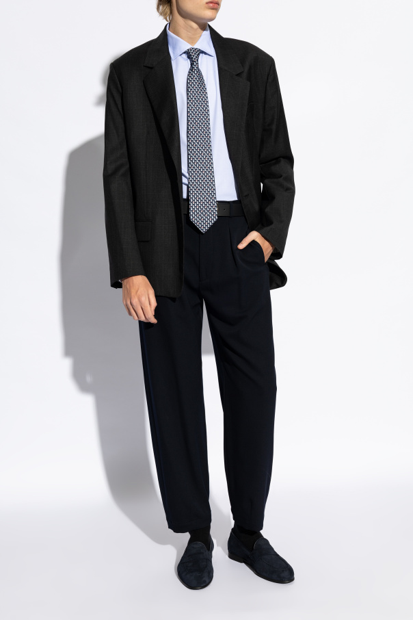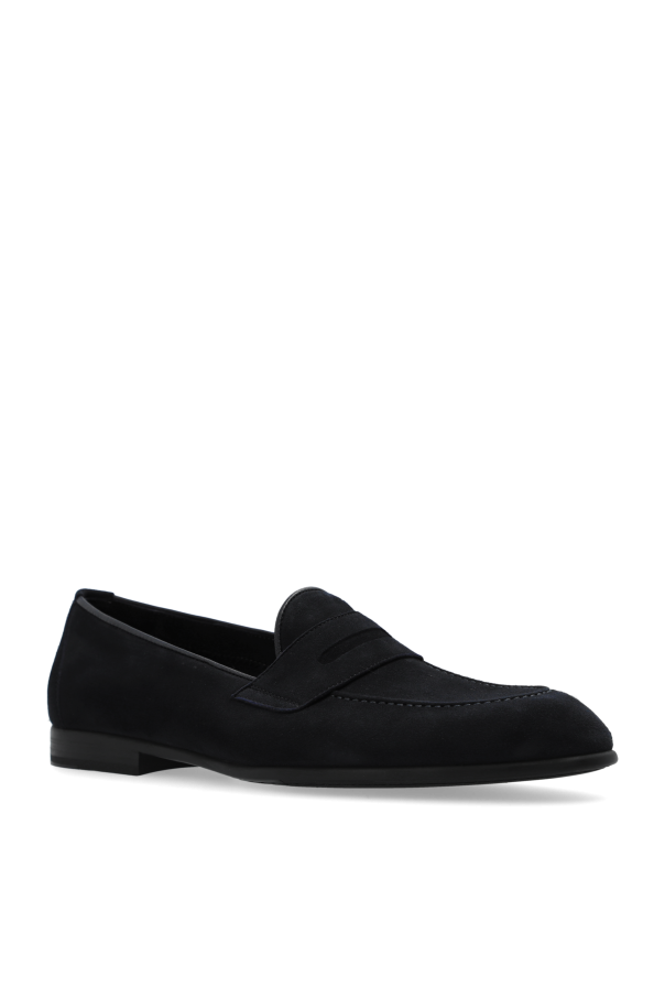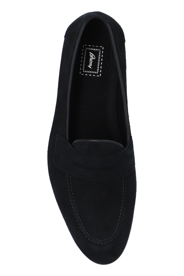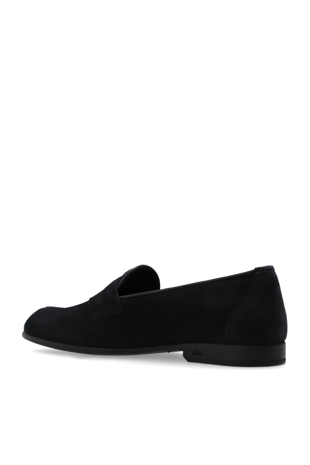 Introducing the exclusive Penny Loafers from the esteemed Brioni collection, crafted for the discerning individual who values both elegance and superior craftsmanship. These loafers are a testament to timeless style and refined luxury. With a classic silhouette, the Penny Loafers feature an elegant, rounded line and slip-on design that epitomizes sophistication. The exterior is meticulously crafted from high-quality suede, offering a subtle yet opulent appearance that is both stylish and versatile. The loafers come in a striking navy blue color, providing a polished and universal appeal, suitable for a variety of ensembles. A characteristic strap adorns the front, embodying the quintessential penny loafer charm. The brand\'s signature label inside the shoe attests to its authenticity and exclusivity. Designed with a low, flat sole in matching navy, these loafers ensure a cohesive and streamlined look. One of the images showcases the loafers paired with elegant trousers and a blazer, demonstrating their suitability for both formal and semi-formal occasions. Why Choose This Product? Exquisite Craftsmanship: Made from 100% premium leather for both the outer and inner layers, with a durable rubber sole. Timeless Design: Classic penny loafer shape with a sophisticated, rounded line. Authentic Luxury: Featuring the renowned Brioni brand mark for guaranteed exclusivity. Versatile Elegance: Perfectly complements both formal and semi-formal attire. Stylish Consistency: The uniform navy blue color ensures a seamless look.