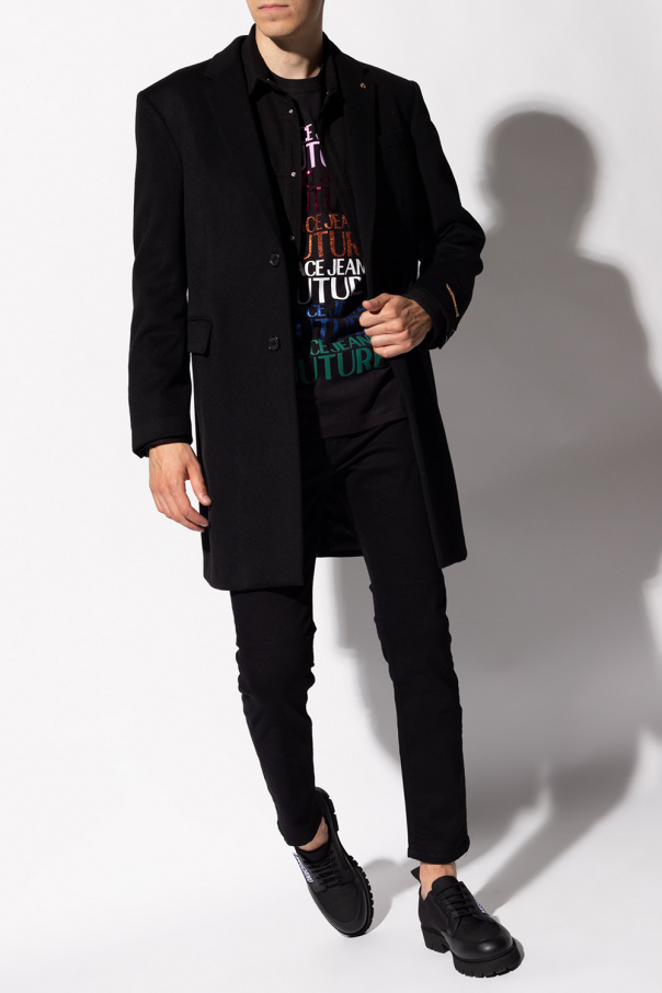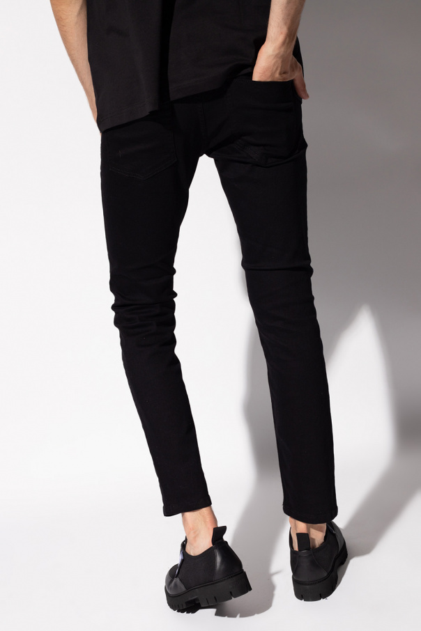 Black jeans from Versace Jeans Couture. Falling down with tapered legs, this pair features a zip fly with a button, classic five pockets and a tactile logo appliqué at the back.