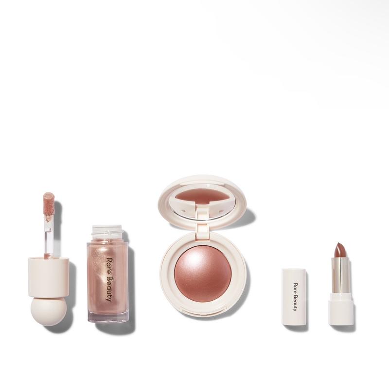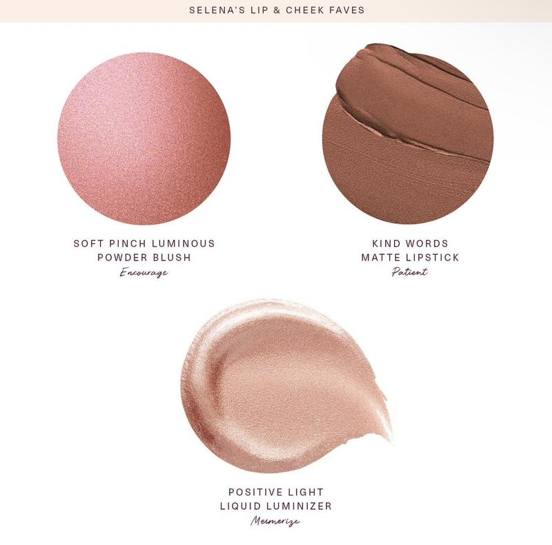 Набор любимых румян Селены: сияющие пудровые румяна стандартного размера и эксклюзивного оттенка, жидкий хайлайтер стандартного размера и эксклюзивная мини-помада.