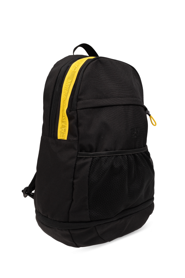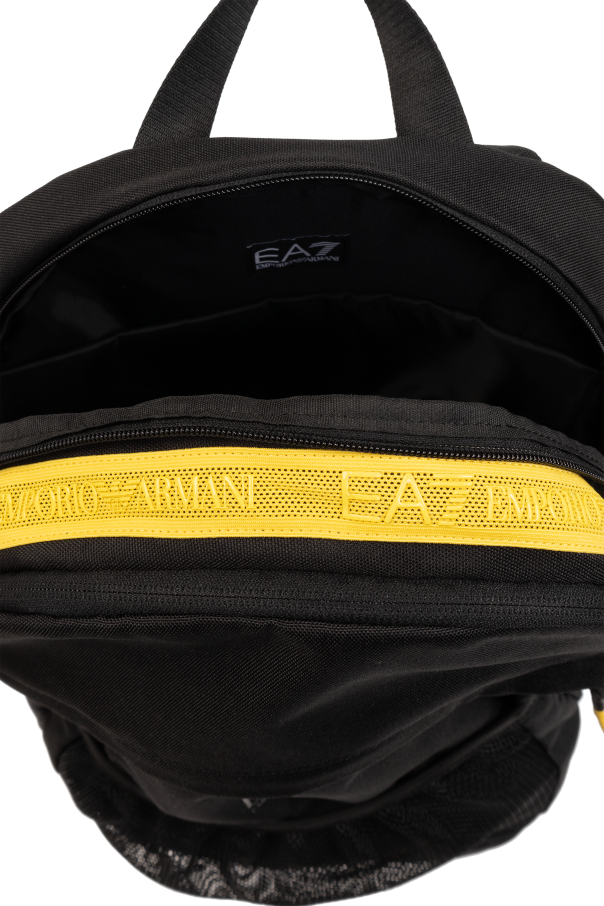 Introducing the EA7 Emporio Armani Sustainability Collection Backpack, a masterpiece that elegantly marries functionality with distinctive aesthetics. Crafted from premium materials, this backpack is designed for the modern man who values sustainability without compromising on style. The dominant black hue is tastefully contrasted with vibrant yellow accents on the straps, zippers, and band details, creating an eye-catching design. Its unique material composition features a mesh texture on the front and side pockets, suggesting durability and breathability. The embossed designer logo on the front pocket and the brand name on a strap at the bottom of the bag elevate its exclusivity. Functionality is at the core of its design, with a spacious main compartment and a front zip pocket for efficient organization. Padded and adjustable straps ensure optimal comfort during use. Inside, the backpack boasts a laptop sleeve and multiple slip pockets, making it incredibly practical for daily use or travel. The interior\'s yellow branding stripe reinforces the brand\'s identity, adding a layer of sophistication. Why Purchase This Product? Exclusive EA7 Emporio Armani design from the \'Sustainability\' collection. Durable and breathable material, ideal for daily use. Optimal organization with multiple compartments and pockets, including a laptop sleeve. Comfortable for extended wear with padded, adjustable straps. Striking contrast of black and yellow, enhancing visual appeal.