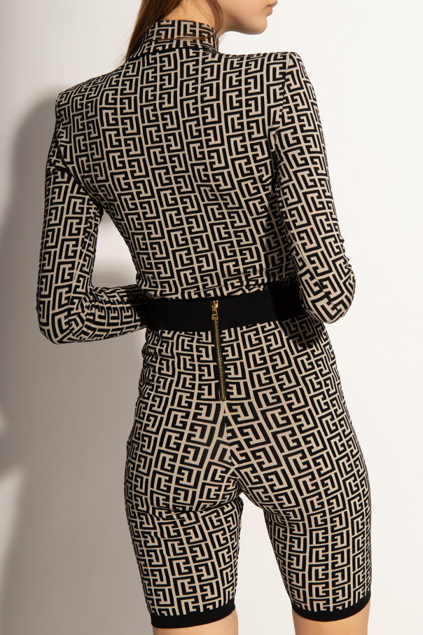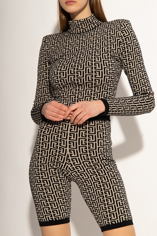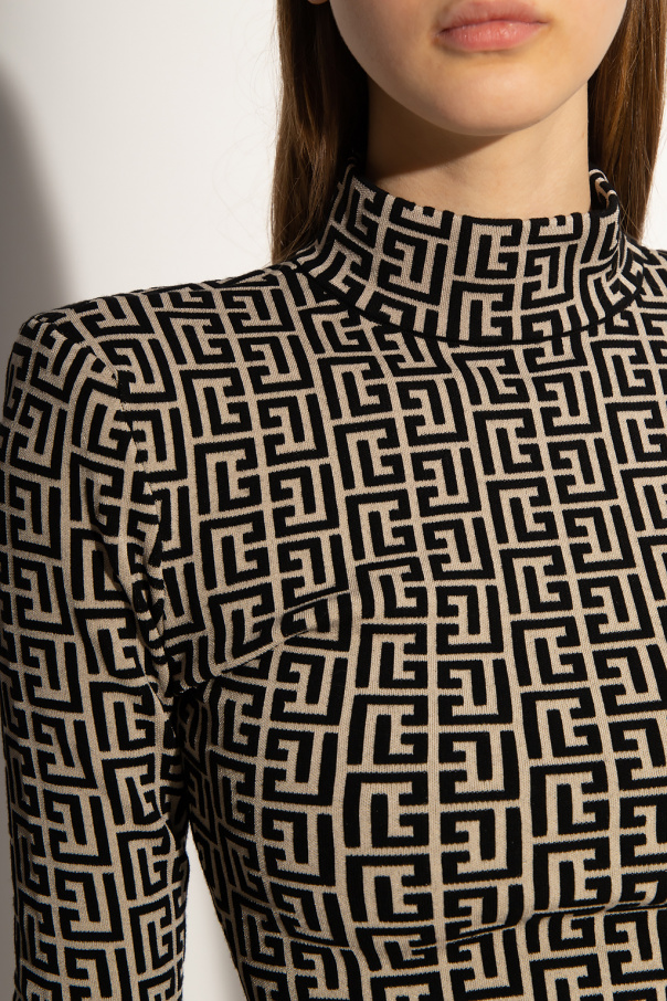 Black and cream top from Balmain. Crafted from a wool blend, this long-sleeve design is complete with a logo embroidery and padded shoulders.