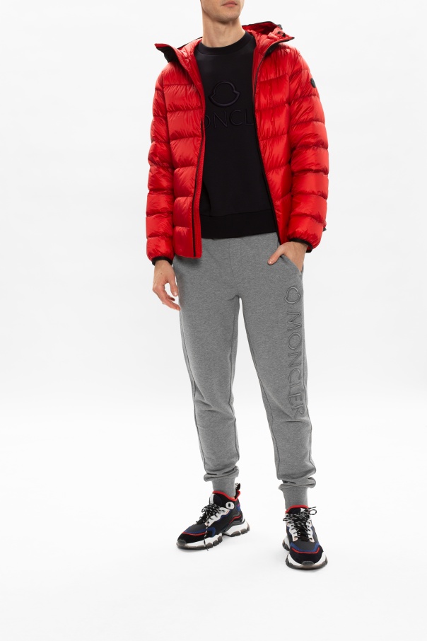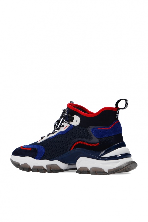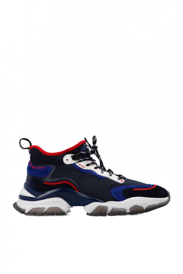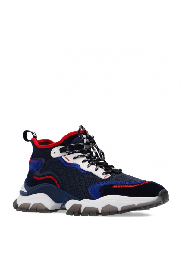 Navy ‘Leave No Trace Mid’ lace-up sneakers from Moncler. Crafted from mesh with suede trims, this high-top design features a logo patch on the tongue, red stitching details and a transparent rubber sole in white and grey.